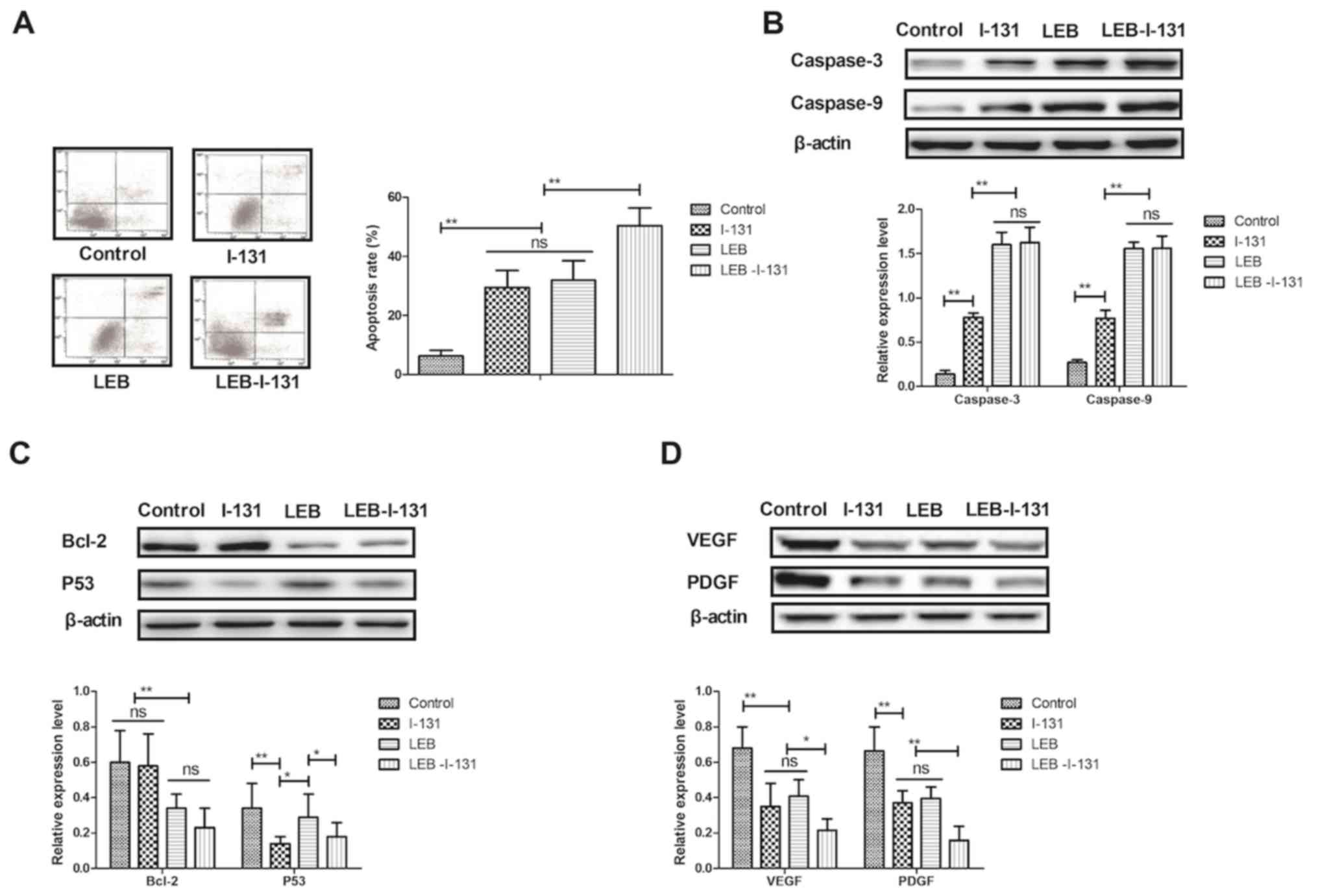 The effects of LEB and I-131 on apoptosis of NPC cells and tumor angiogenic protein expression levels were analyzed in vitro. It was observed that combined treatment of LEB (5 mg/ml) and I-131 (3 mg/ml) significantly promoted apoptosis of HK-1 cells compared with single agents (Fig. 2A). Pro-apoptosis gene expression levels of Caspase-3 and Caspase-9 were significantly upregulated by LEB and I-131 in HK-1 cells (Fig. 2B). Anti-apoptosis gene expression levels of Bcl-2 and P53 were significantly downregulated by combined treatment with LEB and I-131 in NPC cells (Fig. 2C). Furthermore, it was demonstrated that combined treatment with LEB (3 mg/ml) and I-131 (3 mg/ml) significantly inhibited tumor angiogenesis-related protein expression including VEGF and PDGF in HK-1 cells (Fig. 2D). These results suggest that combined treatment with LEB and I-131 may significantly promote apoptosis and inhibit tumor angiogenesis-related protein of NPC cells in vitro.