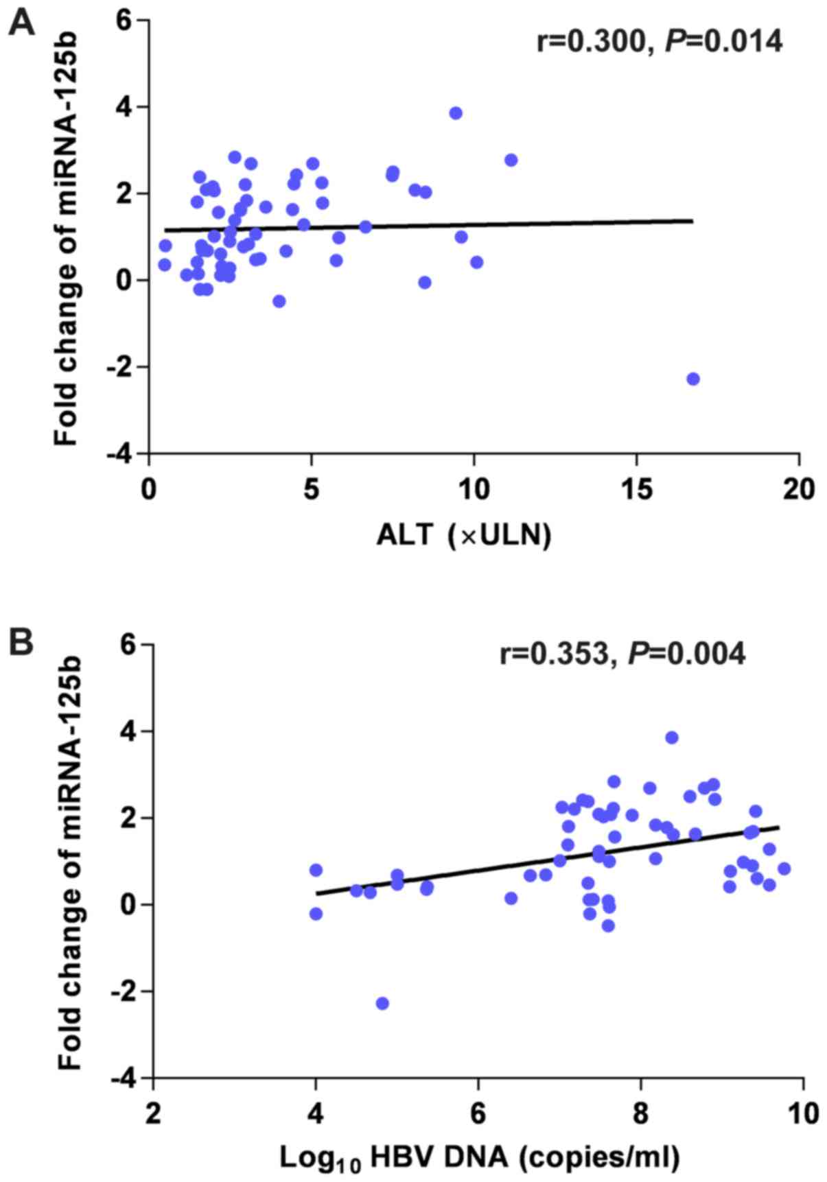 Li F, Zhou P, Deng W, Wang J, Mao R, Zhang Y, Li J, Yu J, Yang F, Huang Y, et al: Serum microRNA-125b correlates with hepatitis B viral replication and liver necroinflammation. Clin Microbiol Infect Dis. 22:384.e1–384.e10. 2016. View Article : Google Scholar