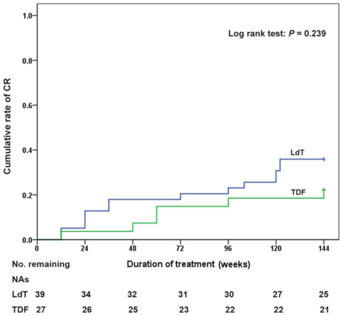 Hsu CW, Chao YC, Lee CM, Chang TT and Chen YC: Efficacy of telbivudine in Taiwanese chronic hepatitis B patients compared with GLOBE extension study and predicting treatment outcome by HBV DNA kinetics at week 24. BMC gastroenterology. 12:1782012. View Article : Google Scholar : PubMed/NCBI