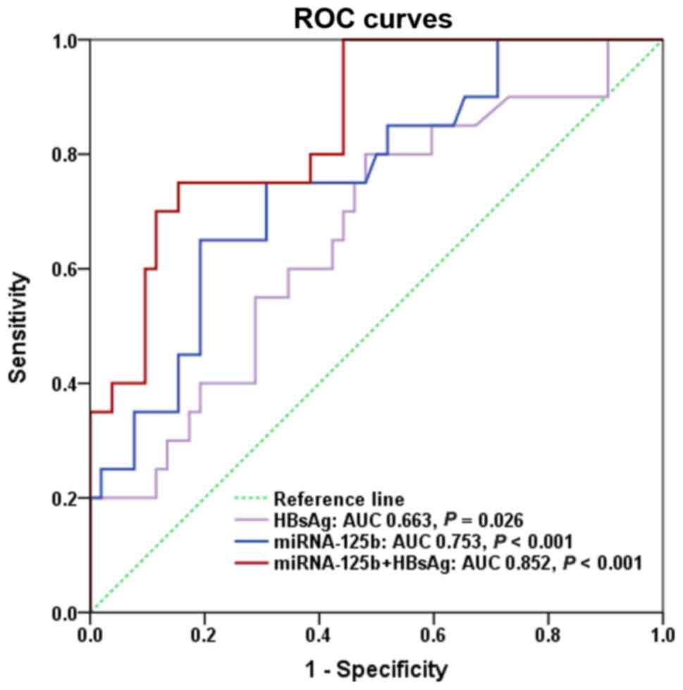 Giray BG, Emekdas G, Tezcan S, Ulger M, Serin MS, Sezgin O, Altintas E and Tiftik EN: Profiles of serum microRNAs; miR-125b-5p and miR223-3p serve as novel biomarkers for HBV-positive hepatocellular carcinoma. Mol Biol Rep. 41:4513–4519. 2014. View Article : Google Scholar : PubMed/NCBI