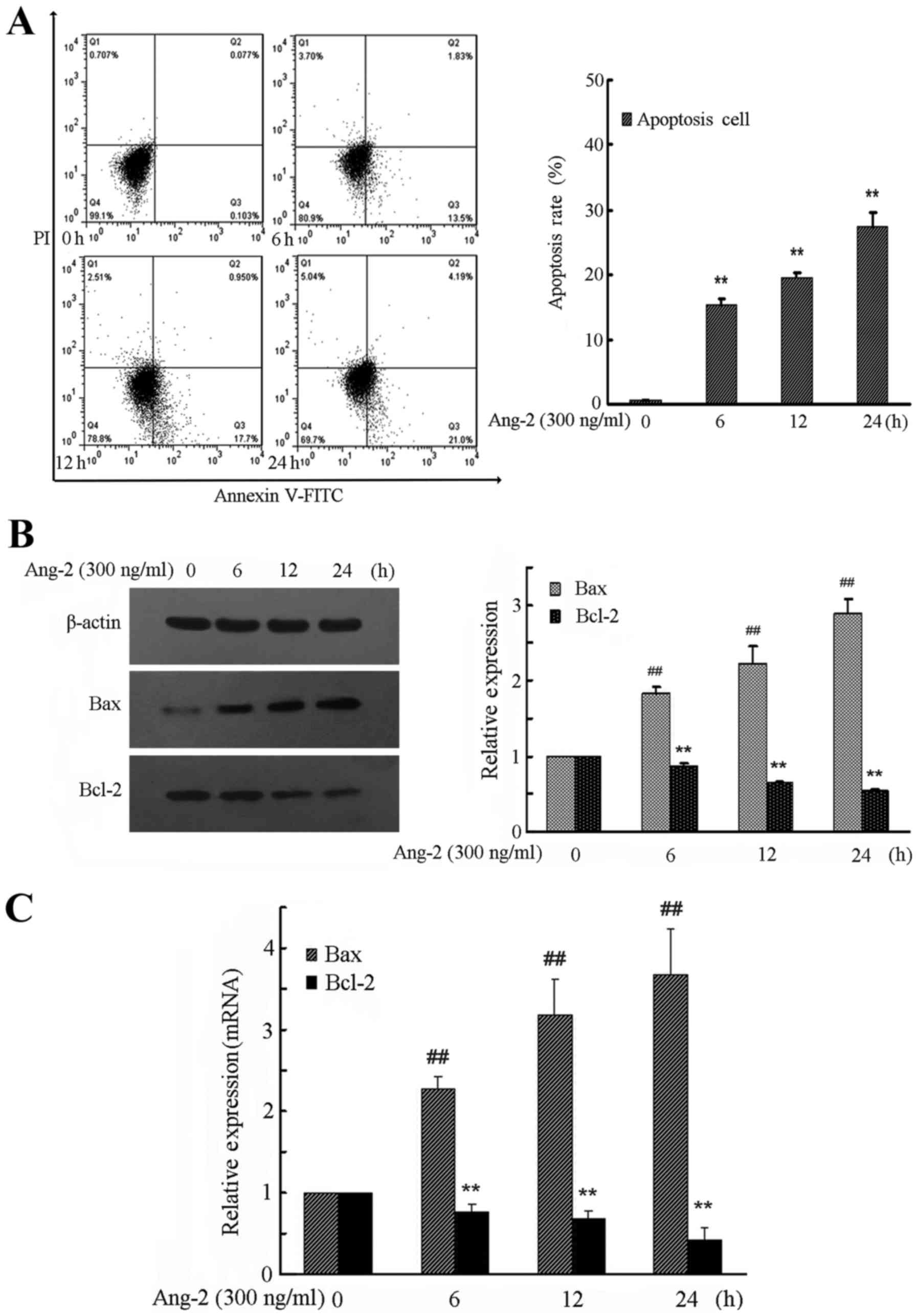 To demonstrate how Ang-2 induces cell apoptosis, flow cytometry with Annexin V-FITC and PI double staining was performed. The results demonstrated a significant increase in the numbers of apoptotic and necrotic cells in the Ang-2 group compared with the control group (Fig. 3A). RPMVECs treated with Ang-2 demonstrated a time-dependent increase in apoptosis rate compared with the control group (P<0.01).