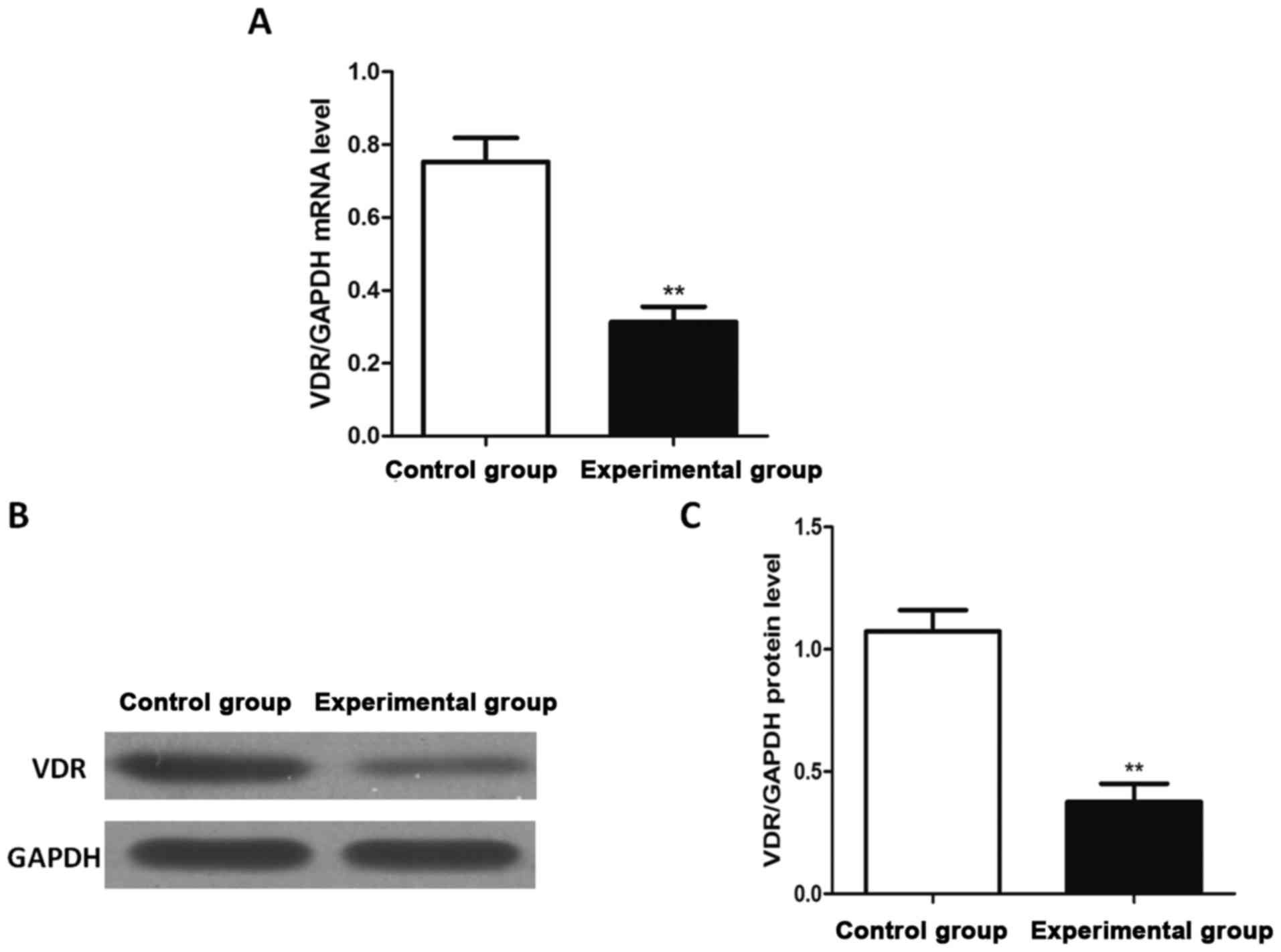 The mRNA and protein expression levels of VDR were detected via reverse transcription-quantitative PCR and western blot analysis, respectively. The results (Fig. 1) revealed that the mRNA and protein expression levels of VDR in experimental group were significantly lower than those in control group, and the differences were statistically significant (P<0.01).