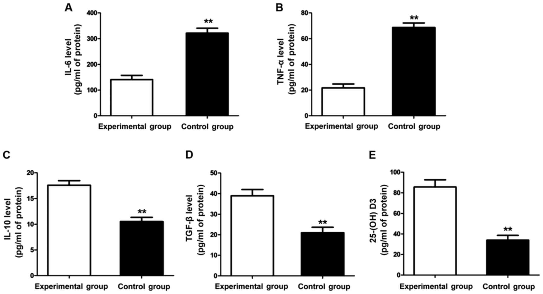 Fasting blood (5 ml)was drawn from patients in each group and centrifuged to obtain the serum. The contents of interleukin-6 (IL-6), IL-10, transforming growth factor-β (TGF-β), tumor necrosis factor-α (TNF-α) and 25-(OH) D3 were detected using the ELISA kit: The standard curves of IL-6, IL-10, TGF-β, TNF-α and 25-(OH) D3 were drawn using the supporting standard samples in the ELISA kit, and the above standard curves were used to quantify the corresponding proteins. Then, 100 µl serum samples in each group were diluted 10-fold using the sample diluent that was added into the sample wells, and the plate was sealed with the sealing membrane for reaction under the constant temperature at 37°C for 60 min. The liquid in the plate was patted dry and added with the corresponding biotin-labeled antibody for reaction at 37°C for 60 min. After that, the liquid in the plate was patted dry again and washed with liquid 3 times (1 min each time). Then, 100 µl avidin-peroxidase complex was added for reaction at 37°C for 30 min. The liquid in the plate was patted dry again 5 times (2 min each time), and 100 µl of stop buffer was added to terminate the reaction. The OD value of each well was measured at 450 nm using a microplate reader (BioTek Instruments, Inc., Winooski, VT, USA), and the serum IL-6, IL-10, TGF-β, TNF-α 25-(OH) D3 levels were calculated using the standard curve.