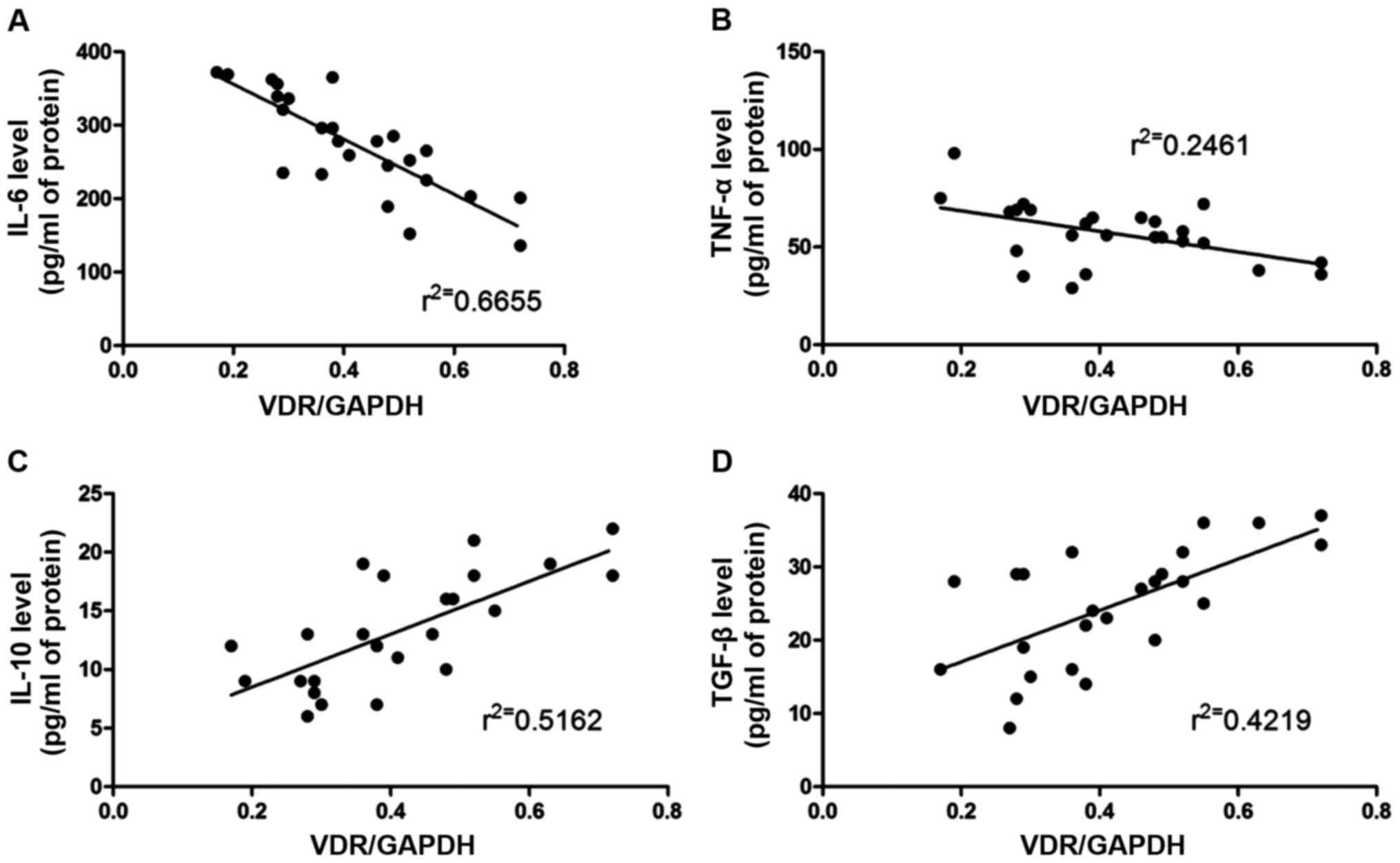 The correlation between the inflammatory factors (IL-6, IL-10, TNF-α and TGF-β) and the VDR expression level was analyzed via Pearson's analysis. The results (Fig. 3) revealed that the VDR expression level was negatively correlated with IL-6 and TNF-α, but positively correlated with IL-10 and TGF-β.