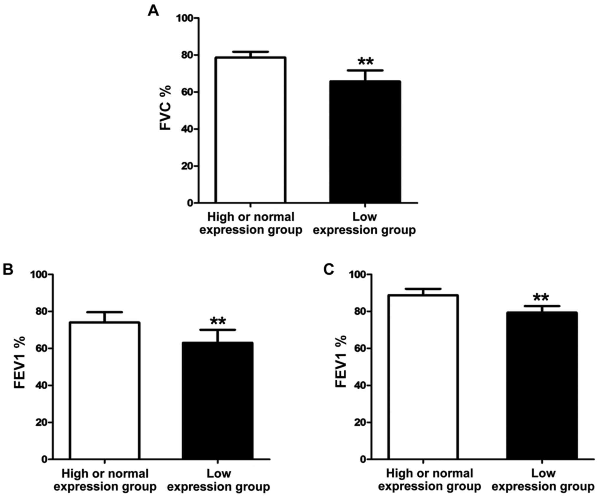 After treatment with the same regimen for 1 year, the lung function of asthma patients was detected using the lung function monitor. The results (Fig. 4) showed that FVC%, FEV1% and PEF25 of patients in high or normal expression group were significantly higher than those of patients in low expression group, and the differences were statistically significant (P<0.01).