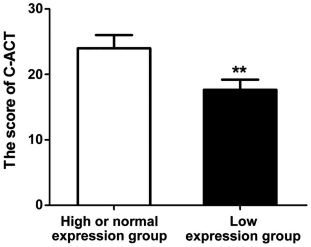 After treatment with the same regimen for 1 year, the prognosis of asthma patients in each group was evaluated using the C-ACT questionnaire, and the score of each patient was recorded. The results (Fig. 5 and Table III) showed that the C-ACT score of patients in the high or normal expression group was significantly higher than that of patients in low expression group, and the difference was statistically significant (P<0.01), and the asthma control rate of patients in the high or normal expression group was obviously higher than that of patients in low expression group (P<0.01).