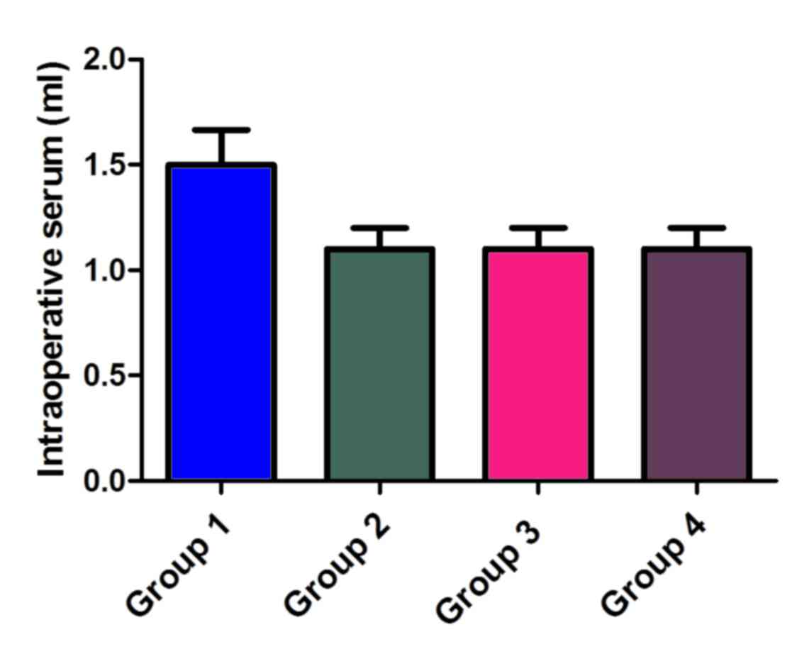 We measured the pupillary diameters on the day of the surgery as follows: Before using tropicamide, one and two hours after instillation of tropicamide and finally at the end of the surgery. We also noted the moment when intraoperative miosis occurred (miosis was considered when the pupillary diameter was ≤4 mm). The largest pupillary diameters were found in the control group (mean value 5.3 mm), and in group 1 (mean value 4.7 mm) with continuous treatment, the smallest pupil diameters. Statistically significant differences occurred when comparing group 2/group 3 (P<0.05) and group 2/control group (P<0.05) before using tropicamide and before the surgery (Fig. 1A). One hour after the tropicamide infiltration, statistically significant P-values were found for the following comparative situations: Group 2/group 4 and group 1/group 4. In both cases P<0.01. (Fig. 1B). After 2 h of tropicamide administration, the P-value was <0.05 when comparing group 2 with group 4 and group 2 with group 3 or group 1 with group 3. The P-value was <0.01 when comparing groups 1 with 4. (Fig. 1C). At the end of the surgery there were statistically significant differences between the four groups as follows: P<0.5 in case of comparison of group 2 with group 3, group 2 with group 4; P<0.01 while comparing group 1 to group 3 and P<0.001 while comparing group 1 (mean value 2.9 mm) to group 4 (mean value 5.6 mm) (Fig. 1D and Fig. 2A-D). The total duration of the intervention post-anesthesia (measured in min) was longer for group 1 and 2 compared to control group 4 (P<0.05; Fig. 3). The total amount of intraoperative serum (measured in ml) was not statistically significantly higher in group 1 with continuous treatment (Fig. 4).