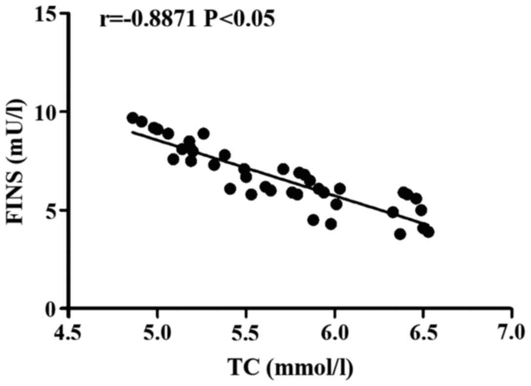 Correlation analysis of TC with FINS in the process of treatment on patients with diabetes mellitus and coronary heart disease using rosuvastatin. The TC level was negatively correlated with FINS level (r= −0.8871, P<0.05) (Fig. 1).