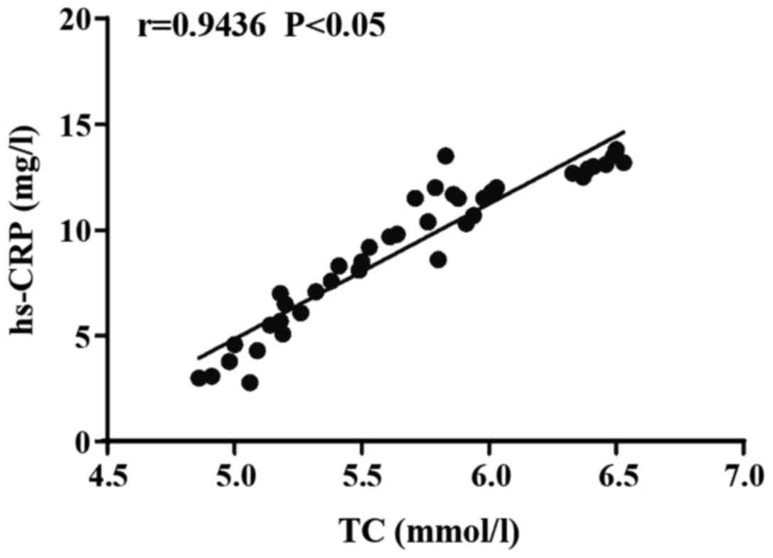The TC level was positively correlated with hs-CRP level (r=0.9436, p=0.000<0.05) (Fig. 2).