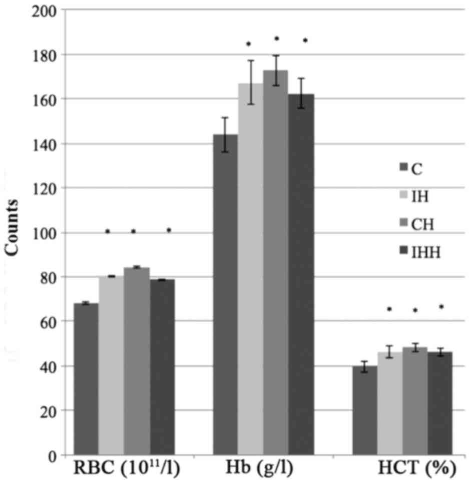 The red-cell count, hemoglobin and hematocrit levels of the three different models of hypoxia were significantly increased compared with those of control group (P<0.05; Fig. 2), suggesting that successful hypoxia models were established.