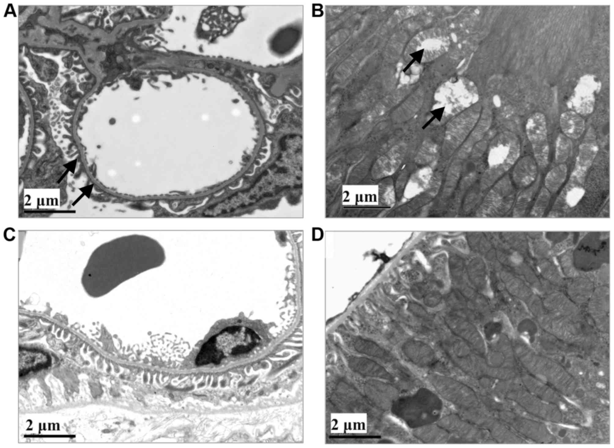 Transmission electron micrographs of rat kidney tissues were captured. Fusion of the foot process was visualized in the glomerulus. In the proximal convoluted tubules, additional secondary lysosomes and vacuoles were observed. Swelling and degeneration of mitochondria was identified in the tubules (Fig. 4).