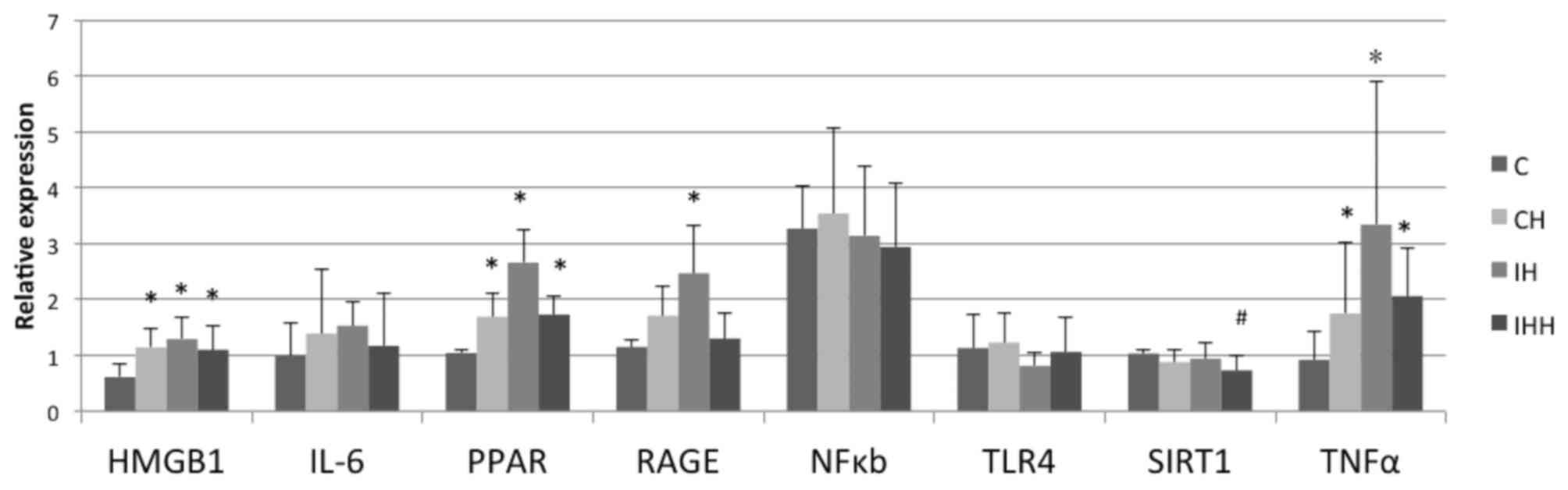 Table I.Quantitative polymerase chain reaction primer sequences of HMGB1, TLR4, NF-κB, RAGE, TNF-α, IL-6, PPAR, SIRT1 and internal reference 28S. |