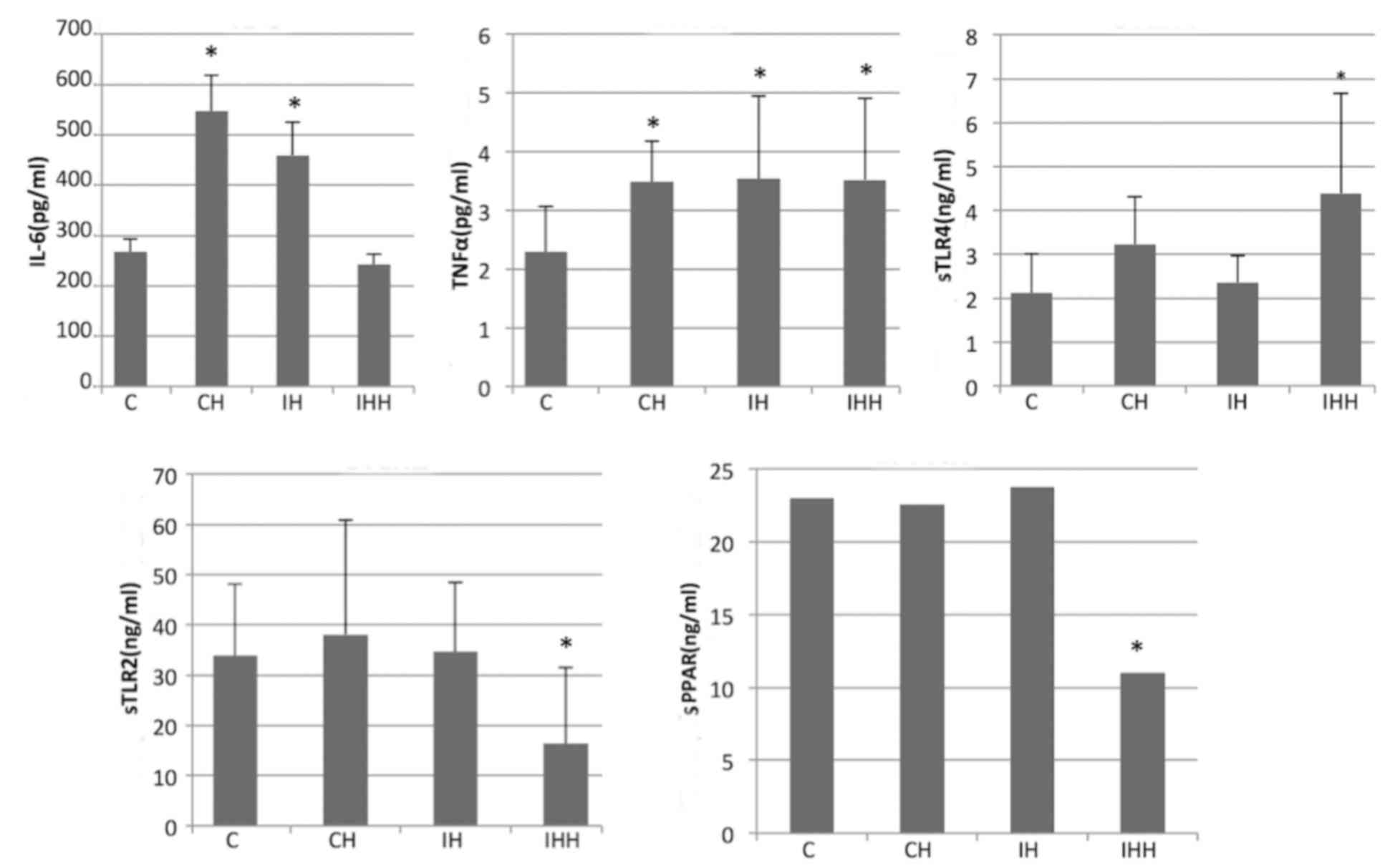 Hypoxia increased the expression of IL-6, TNF-α, soluble TLR4, and decreased the expression of soluble TLR2 and PPAR (Fig. 7). In the IHH group, the expression of the sTLR2 (16.35±15.21 vs. 33.84±14.28) and sPPAR (11.00±6.99 vs. 23.00±9.30) in the peripheral blood was significantly decreased compared with the control group (P<0.05). In addition, compared with the control group, no significant difference in the expression of sTLR2 and sPPAR in CH and IH were observed (P>0.05). It was also demonstrated that hypoxia increased the levels of TNF-α, IL-6 and sTLR4 expression in the peripheral blood. The expression of TNF-α in the CH (3.48±0.69), IH (3.54±1.40) and IHH (3.52±1.39) groups was significantly upregulated compared with the controls (2.29±0.78; P<0.05).