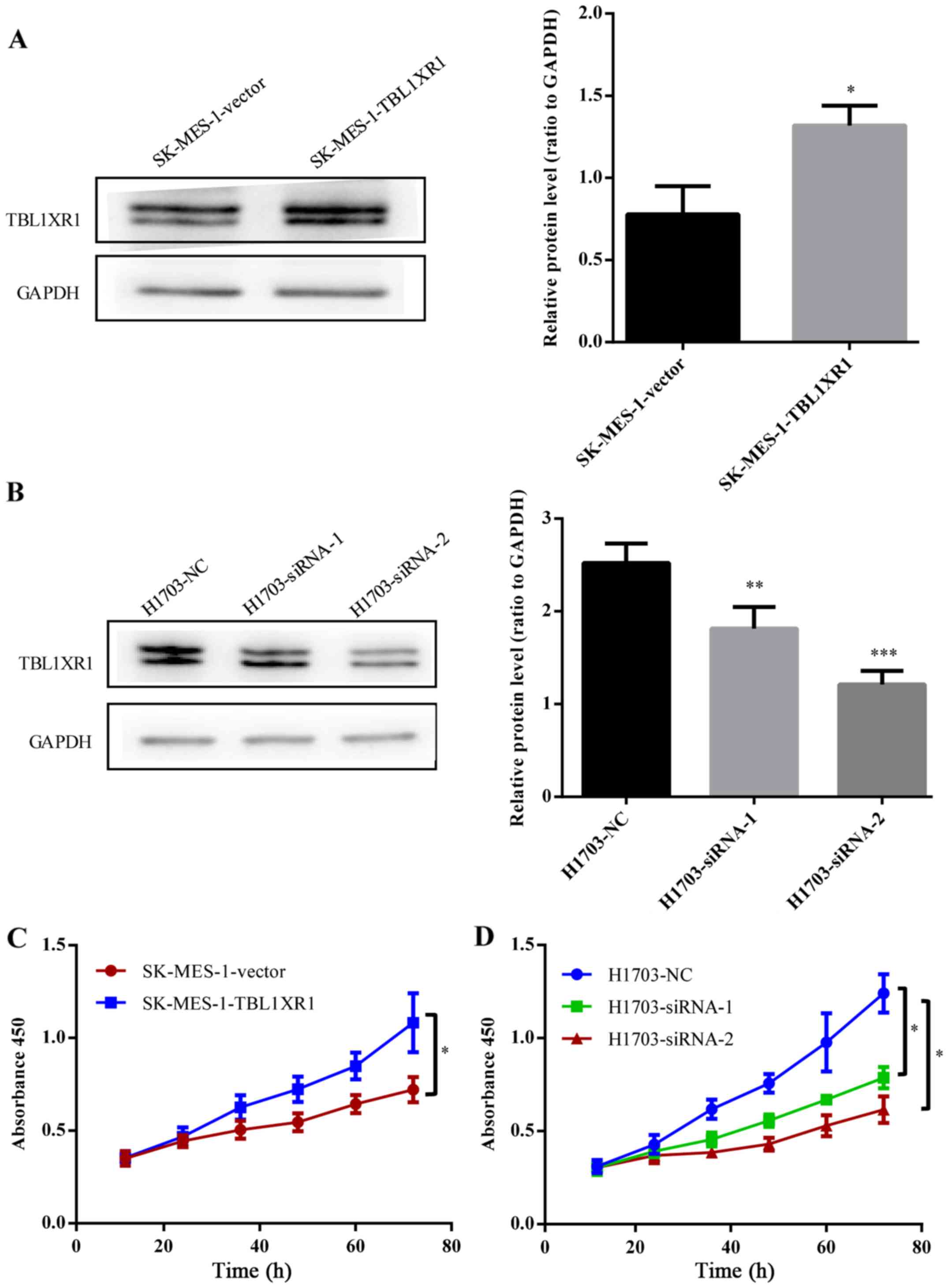 The TBL1XR1 plasmid was purchased from Shanghai GeneChem Co., Ltd. (Shanghai, China). The corresponding vector was pEX-1. The TBL1XR1 plasmid and corresponding empty vector were transfected into SK-MES-1 cells using Lipofectamine® 2000 reagent (Invitrogen; Thermo Fisher Scientific, Inc.), according to the manufacturer's protocol. Stably transfected cells (SK-MES-1-vector, SK-MES-1-TBL1XR1) were selected by puromycin (1 ug/ml; InvivoGen, San Diego, CA, USA). TBL1XR1 siRNA sequences and negative control sequences were designed and synthesized by Shanghai GeneChem Co., Ltd. H1703 cells were cultured in six-well plates and transfected with 400 ng TBL1XR1 small interfering (si)RNA (si-TBL1XR1-1, 5′-GCAGCAUAAAGGCCCUAUATT-3′; si-TBL1XR1-2, 5′-GCCUGAUGUAGUACAAACATT-3′) using Lipofectamine® 2000 reagent (Invitrogen; Thermo Fisher Scientific, Inc.) according to the manufacturer's protocol. Stable cell lines expressing TBL1XR1-siRNA [negative control, (H1703-NC), H1703-siRNA-1, H1703-siRNA-2] were generated with 1 ug/ml puromycin. Knockdown and overexpression of TBL1XR1 were confirmed by western blot analysis. Western blotting was performed as stated below.