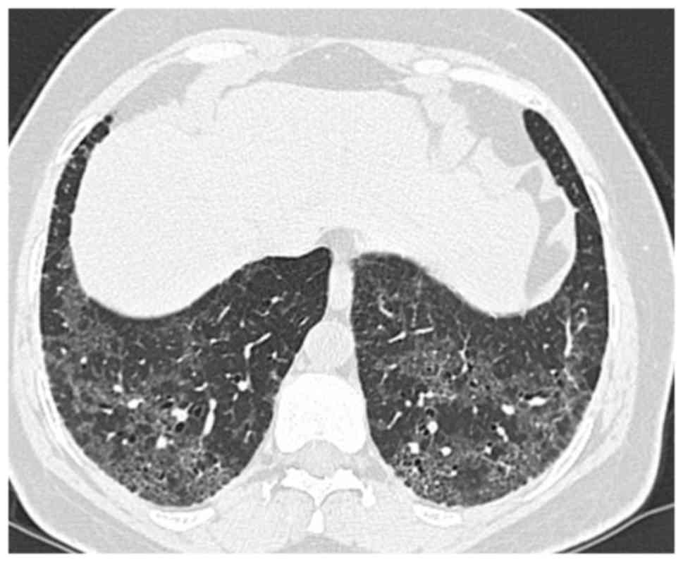 Diagnostic radiological findings are rather apparent from thoracic high-resolution computed tomography (HRCT; Fig. 2; patient provided informed consent for inclusion in the present study). An invariable HRCT finding is the presence of a diffuse ground-glass appearance, usually symmetrical and frequently involving the middle and lower zones (6,36,37). While involvement of upper zones is seen in most cases, their predominant involvement is relatively rare. All regions may be affected, although subpleural involvement is most common. Other HRCT findings include irregular lines and traction bronchiectases indicating parenchymal distortion (38). Peripheral microcysts implying dilated bronchioles and alveolar ducts may be seen (39). Honeycomb appearance is not common.