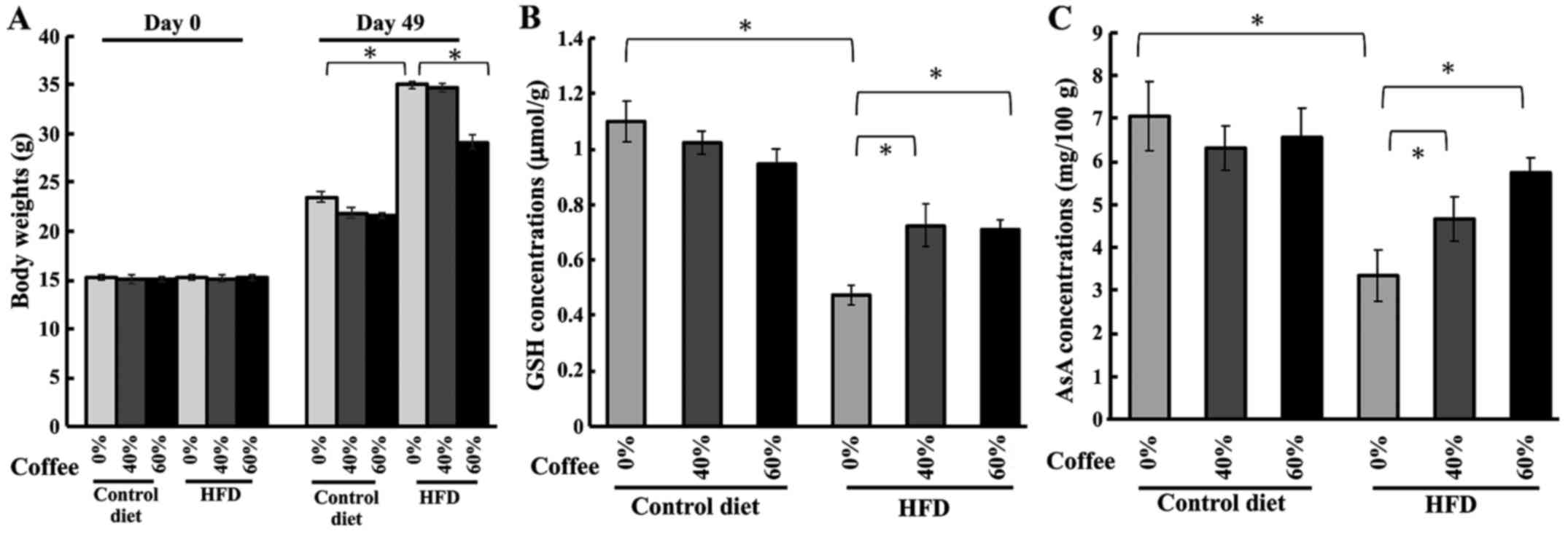 Recently, our laboratory demonstrated that coffee consumption significantly improved metabolic symptoms in mice, including body weight reduction and the accumulation of adipose tissue (8). Owing to the fact that coffee contains over 1,000 bioactive compounds, including antioxidant, anti-inflammatory, and anti-cancer agents, the accumulation of evidence from numerous epidemiological studies has revealed that coffee consumption could lower the risk of various chronic illnesses, such as cancer, cardiovascular disease, type 2 diabetes, and cataract (9–11). The effect of coffee consumption on antioxidant activity is unlikely to be a direct consequence of the antioxidant properties of the coffee brew; they are more likely to result from certain constituents of coffee augmenting endogenous antioxidant defences, such as upregulation of GSH concentration and glutathione-S-transferase (GST) activity (12). Numerous studies have shown that consumption of coffee brew helps to mitigate cataract formation in humans and animals (5,13,14). We hypothesized that coffee intake could prevent obesity related-cataracts; however, the effect of coffee consumption on this type of cataract remains unknown. To validate this hypothesis, we investigated the effect of coffee on obesity-related cataract development. In this study, we evaluated the anti-cataract activity of coffee consumption by using high-fat diet (HFD)-fed animals as an obesity-induced cataract model and measured the levels of GSH and AsA in the lens.