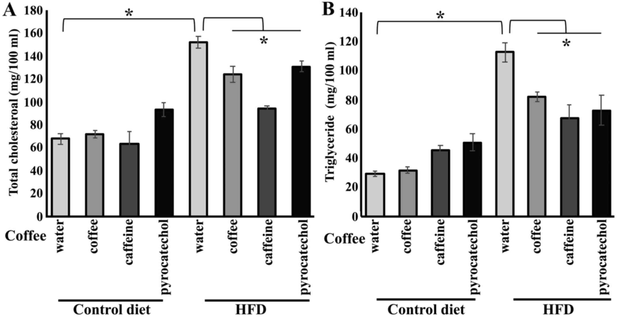 Subsequently, we quantified the levels of plasma cholesterol and triglycerides to evaluate the effects of coffee and coffee constituents on blood. Total cholesterol levels in HFD-fed mice were significantly higher compared to the levels in control diet group. Coffee brew, caffeine, or pyrocatechol treatment in HFD-fed mice group prevented elevation of total cholesterol (Fig. 4A). Next, the levels of plasma triglycerides in HFD-fed mice were measured, with or without administration of coffee constituents. Plasma triglycerides level was significantly higher in HFD-fed mice, however, increase in triglycerides level was negated by administration of coffee constituents (Fig. 4B).
