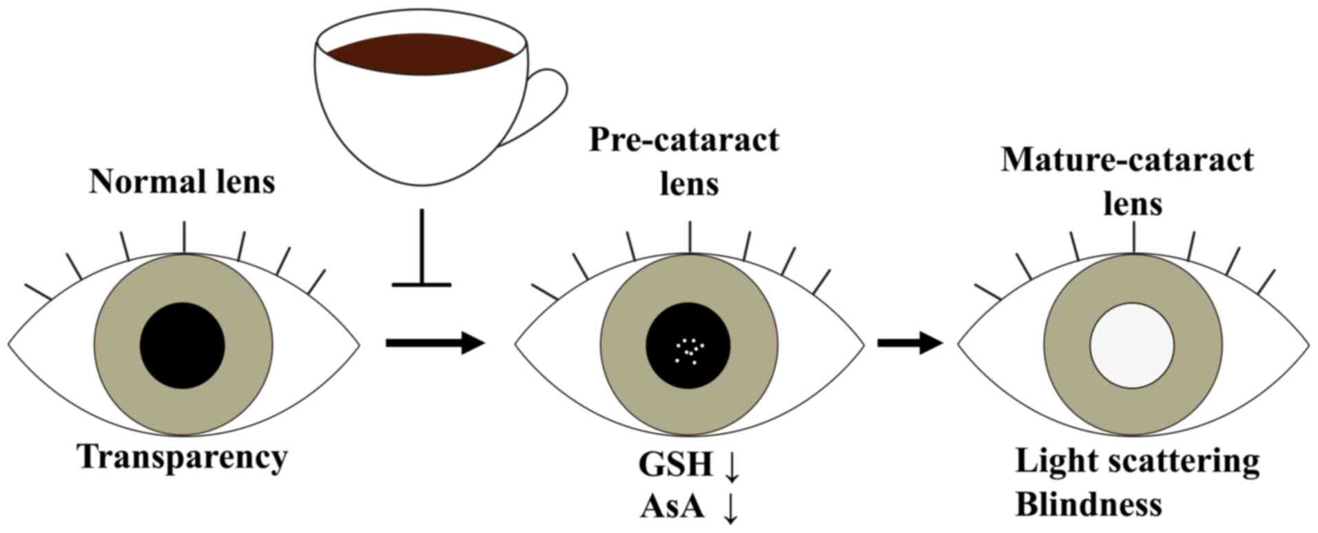 Ishimori N, Oguchi J, Nakazawa Y, Kobata K, Funakoshi-Tago M and Tamura H: Roasting enhances the anti-cataract effect of coffee beans: Ameliorating selenite-induced cataracts in rats. Curr Eye Res. 42:864–870. 2017. View Article : Google Scholar : PubMed/NCBI | |