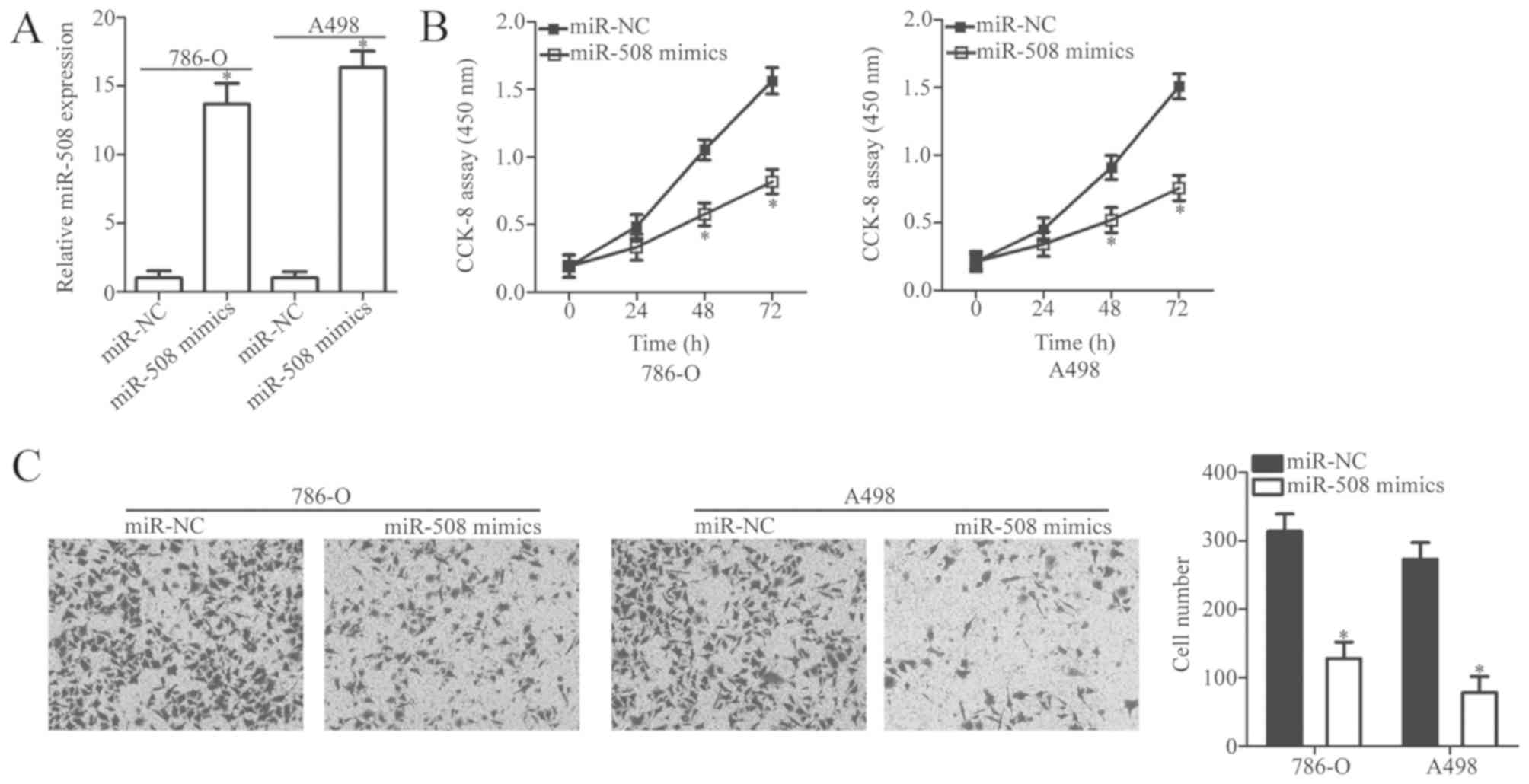 To investigate the biological function of miR-508 in ccRCC progression, ccRCC cell lines 786-O and A498 (as they exhibited the lowest miR-508 expression) were transfected with miR-508 mimics or miR-NC. The relative expression of miR-508 was significantly increased in ccRCC cells following transfection with miR-508 mimics compared with miR-NC (P<0.05; Fig. 2A). A CCK-8 assay was then used to examine the effect of miR-508 overexpression on ccRCC cell proliferation. The results demonstrated that miR-508 overexpression significantly inhibited the proliferative ability of 786-O and A498 cells when compared with the negative controls (P<0.05; Fig. 2B). Subsequently, the in vitro Transwell invasion assay demonstrated that miR-508 overexpression significantly inhibited the invasive capacity of 786-O and A498 cells compared with the negative controls (P<0.05; Fig. 2C). Taken together, these results suggest that miR-508 may serve a tumor-suppressive role in the development of ccRCC.