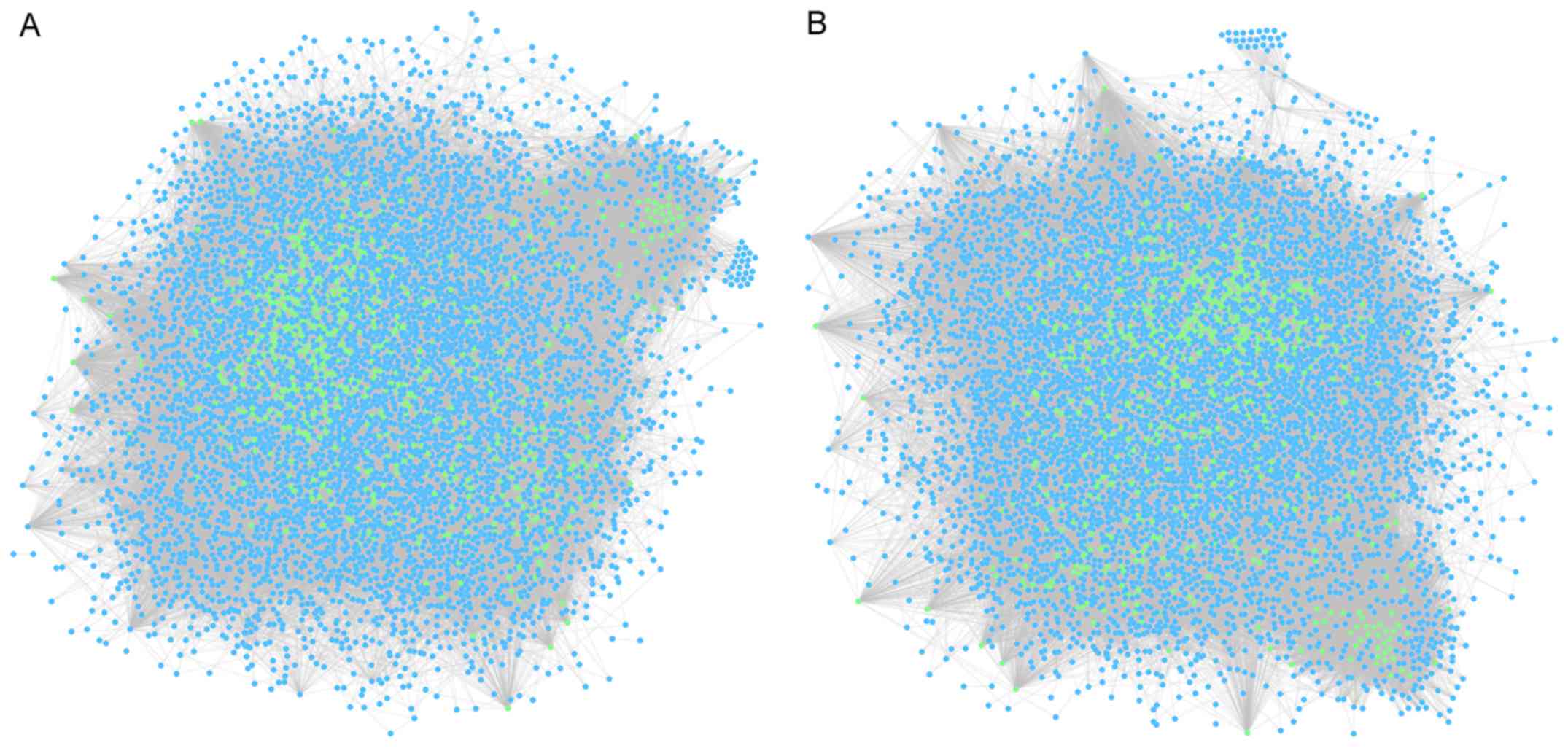 After we mapped the microarray data to the background PPIN, an informative PPIN was extracted, which included 15,248 genes. To increase the network confidence, only interactions with scores ≥0.8 of the informative PPIN were selected in order to build DENs. Finally, we constructed two DENs, and each of them covered 87,702 edges, as well as 6,576 nodes. The DEN compositions are shown in Fig. 1.