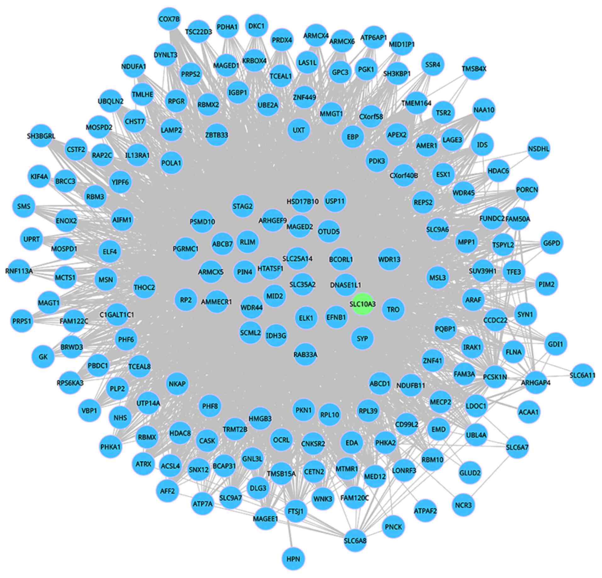 When FDR was set as 0.05, we found only module 493 observed in the DENs of aging group 70–80 years, and aging group >80 years was dynamic. This dynamic DM 493 including 187 nodes and 4,006 interactions is shown in Figs. 2 and 3. Among these 187 nodes, only one informative gene SLC10A3 appeared in this network. In the aging development, the connectivity of the interactions in this dynamic module was significantly changed, which further suggested that network rewired exerts key functions during the aging progression.
