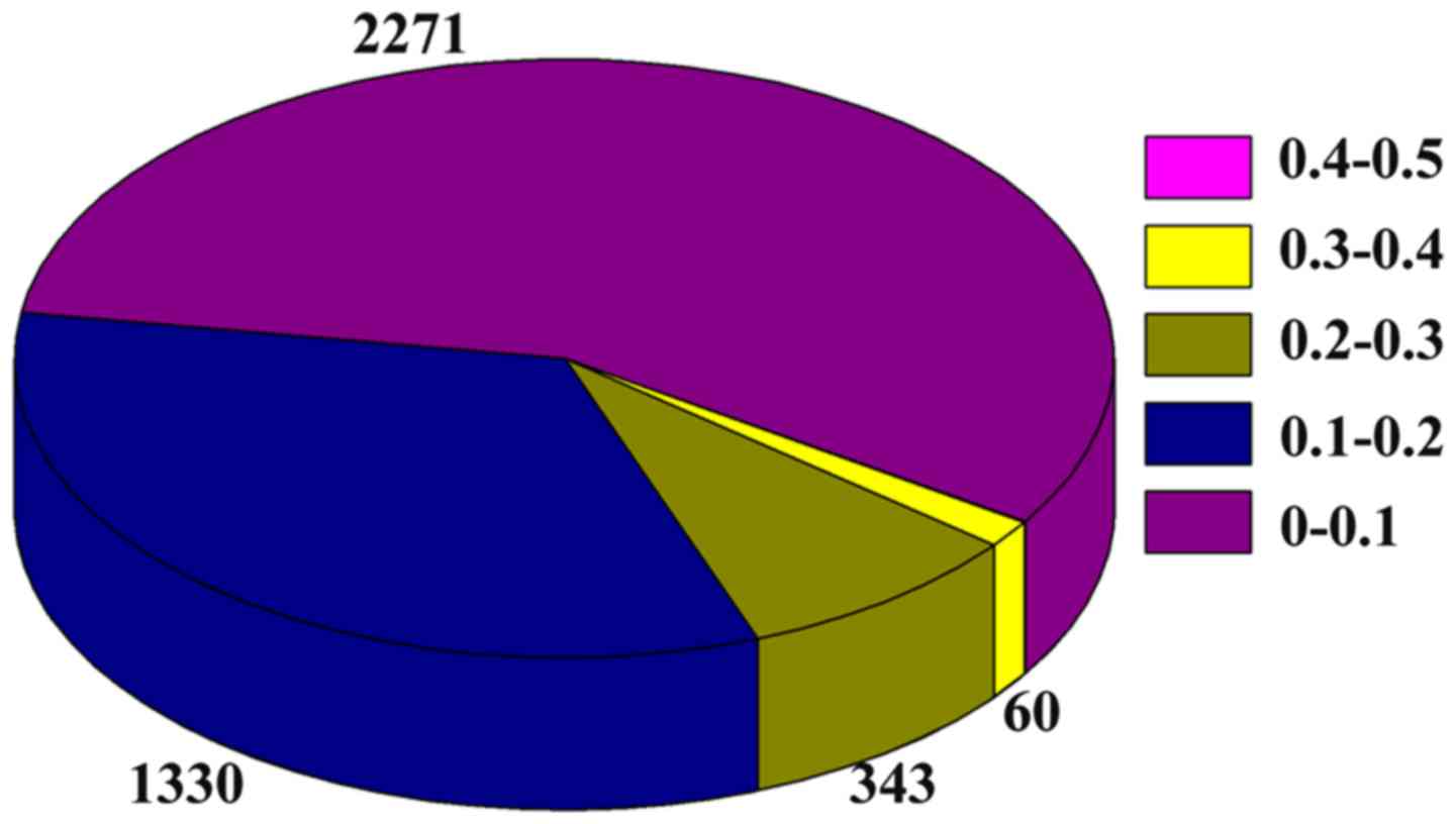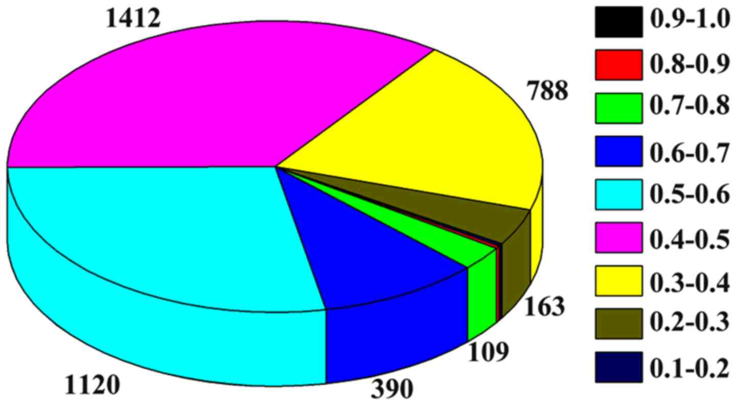 Because the weight of edges in the DENs is a measurement of evaluating the differential expression between control and disease, the average edge weight acts as a way to assess the differential activity of the module. Figs. 4 and 5 show the weight distribution of the interactions in the dynamic 2-DMs for the aging groups 70–80 years and >80 years, respectively. As shown in Fig. 4, the majority of interactions in the network of the aging group 70–80 years are distributed in the weight distribution of 0.3–0.4, 0.4–0.5, and 0.5–0.6. However, the majority of interactions in the network of the aging group >80 years are distributed in the weight distribution of 0–0.1, and 0.1–0.2, as shown in Fig. 5.