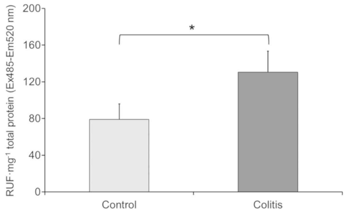 To evaluate liver damage, we measured the reactive oxygen species (ROS) in liver samples of mice with and without colitis. The crude extracts of mice liver without colitis had a ROS level of 79 relative units of fluorescence (RUF) total protein • mg−1. In contrast the crude extracts of mice liver with colitis presented higher ROS level 130.6 RUF total protein • mg−1, (Fig. 2), these results indicate that effectively, ROS levels increase in the liver samples from mice with colitis.