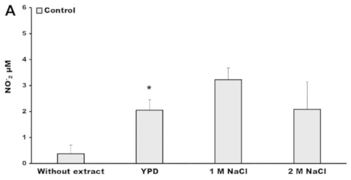 It is known that after a denitrase reaction occurrs there is an increase in the nitrite levels (22). Thus, next we quantified the nitrites concentration after the incubation assay of crude extracts of livers with the crude extract of the yeast. We found in the liver samples without yeast extract that the concentration of nitrites were 0.41 and 0.37 µM, respectively (Fig. 4). By contrast, after the incubation with the yeast extract the nitrites reached the highest concentration, and significant differences of nitrites were observed in colitis samples incubated with the extract of yeast grown in 1 M NaCl (Fig. 4B). However, we observed almost the same value of nitrites concentration in the incubation assay of control and colitis samples with the crude extract of the yeast grown in 2 M NaCl (Fig. 4).