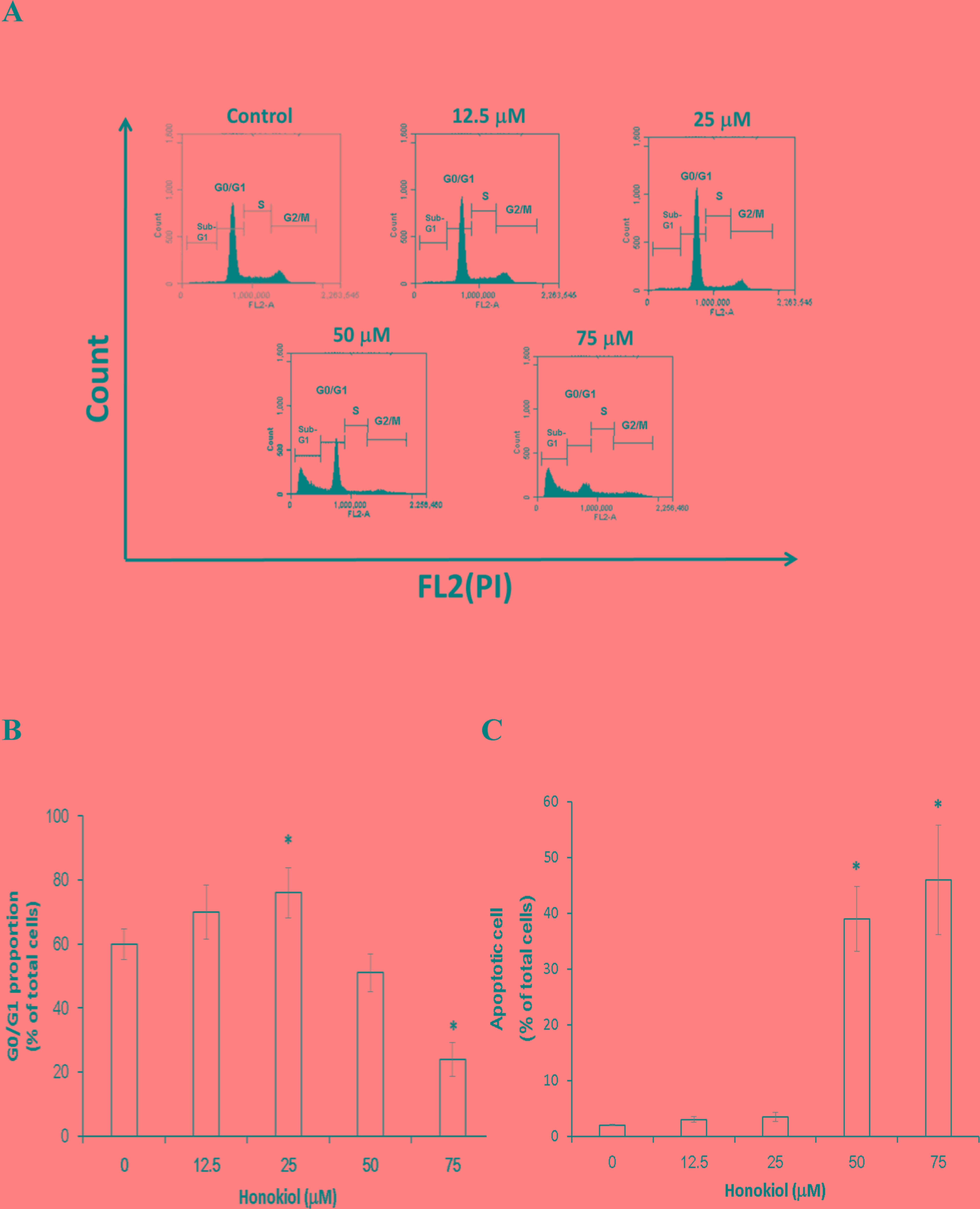 The effect of honokiol on cell cycle progression was then investigated. It was revealed that low doses of honokiol induced significant cell cycle arrest in G0/G1 phase (P<0.05), with the population in that phase demonstrating an increase from 60±4.8% in the control group to 70±8.4 and 76±7.9% in the groups treated with 12.5 and 25 mM honokiol, respectively, for 72 h incubation (Fig. 2A and B). Furthermore, the high dose of honokiol increased the population in sub-G1 phase that resembles apoptotic cells (P<0.05); the sub-G1 phase population increased from 3±1.8% in the control group to 38±3.7 and 46±2.8% following treatment with 50 and 75 µM honokiol, respectively, for 72 h (Fig. 2C).