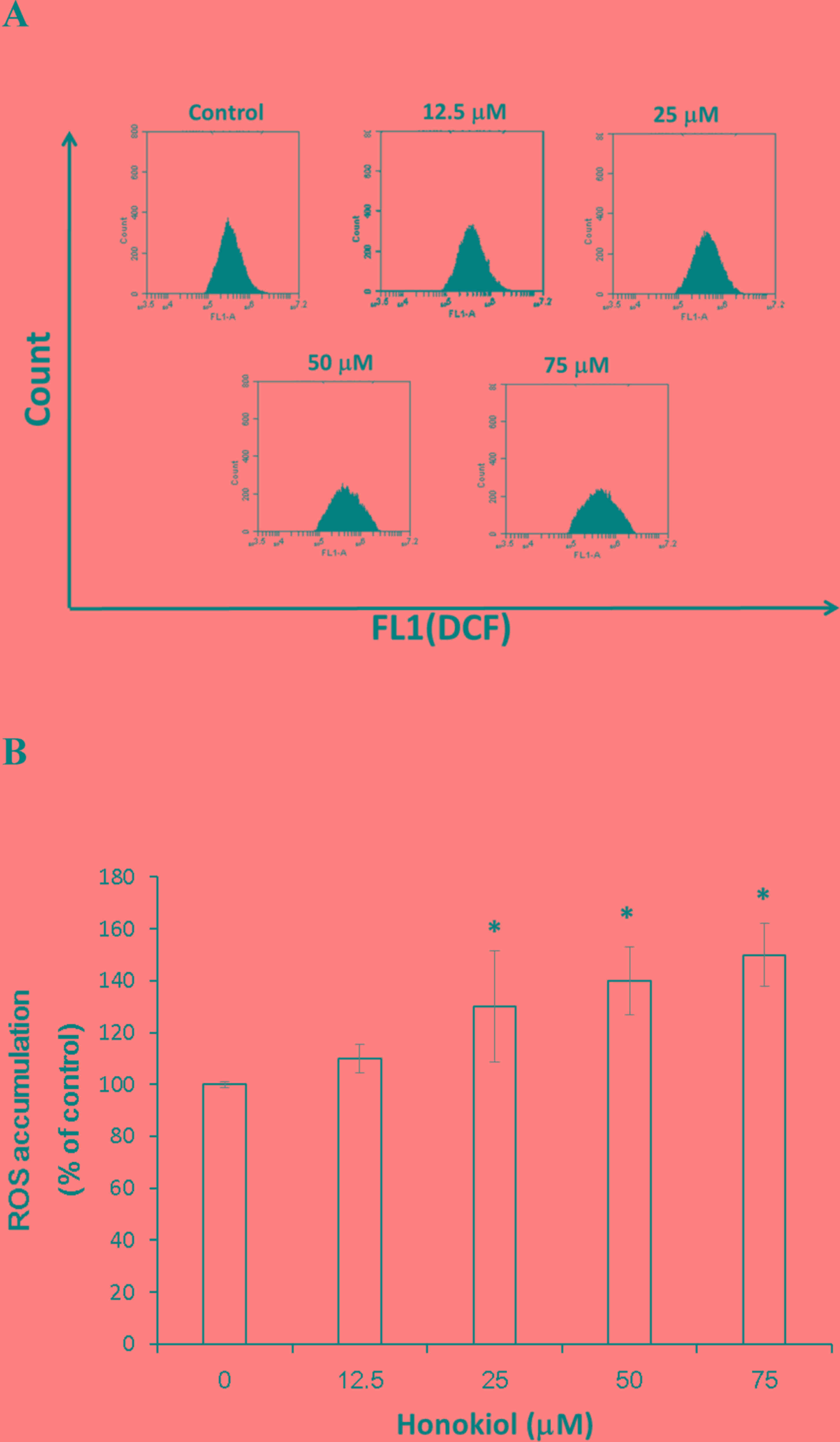The cells were treated with various concentrations of honokiol for 24 h. At the end of the incubation, the floating and the adherent cells were harvested and then incubated with DCFH2-DA (final concentration, 20 µM) for 30 min after washing with cold PBS. Finally, the cells were re-suspended in 500 µl PBS and analyzed by flow cytometry (BD Biosciences). The data for 10,000 cells were collected and evaluated with BD Accuri™ C6 software (BD Biosciences).