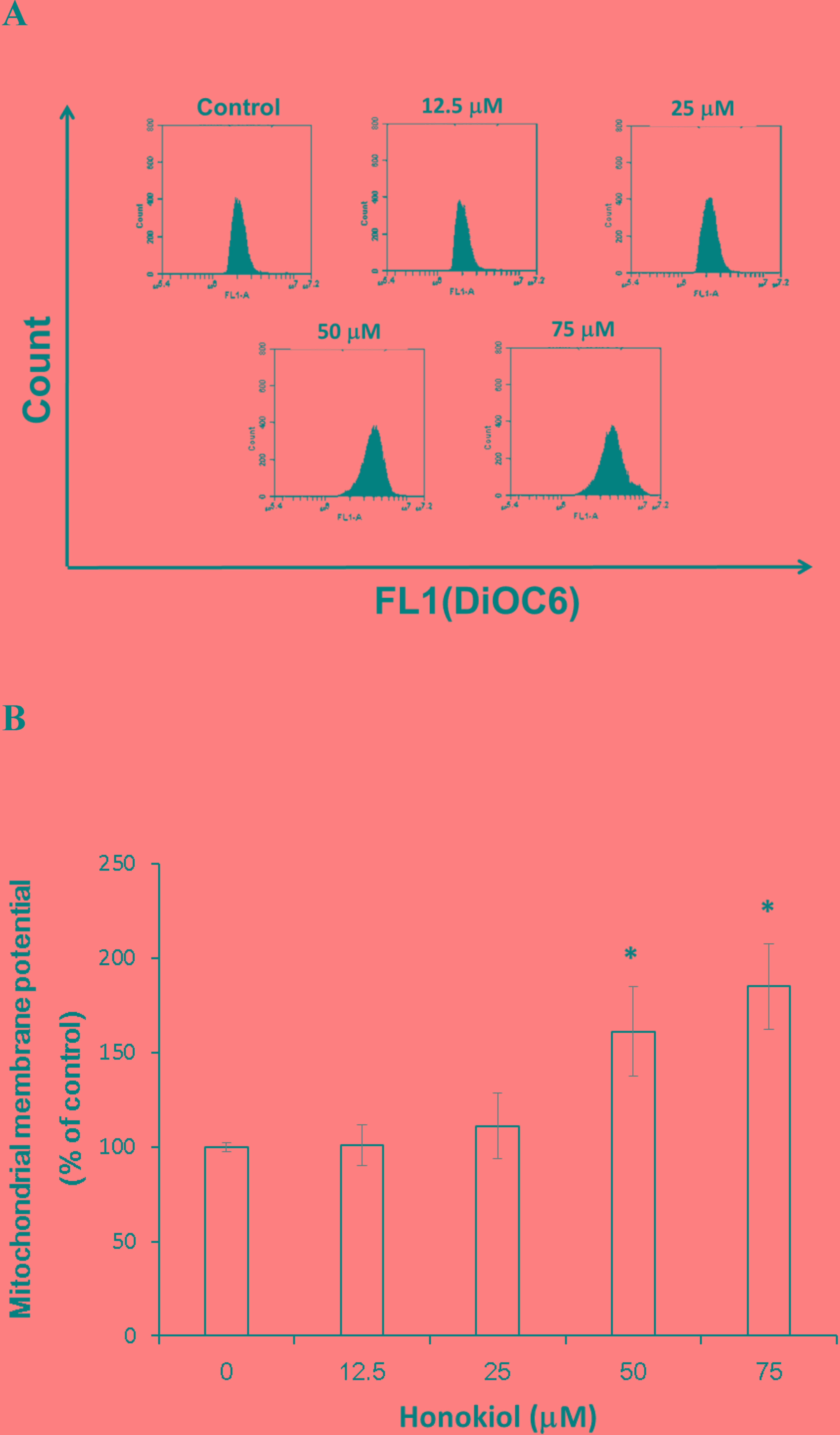 Cells were treated with various concentrations of honokiol for 48 h. At the end of the incubation, the floating and the adherent cells were harvested and then incubated with DiOC6 (final concentration, 40 µM) for 15 min at 37°C in the dark after washing with cold PBS. Finally, the cells were resuspended in 500 µl PBS and then analyzed in the FL-1 channel by flow cytometry (BD Biosciences). Data were collected from 10,000 cells and evaluated with BD Accuri™ C6 software (BD Biosciences).