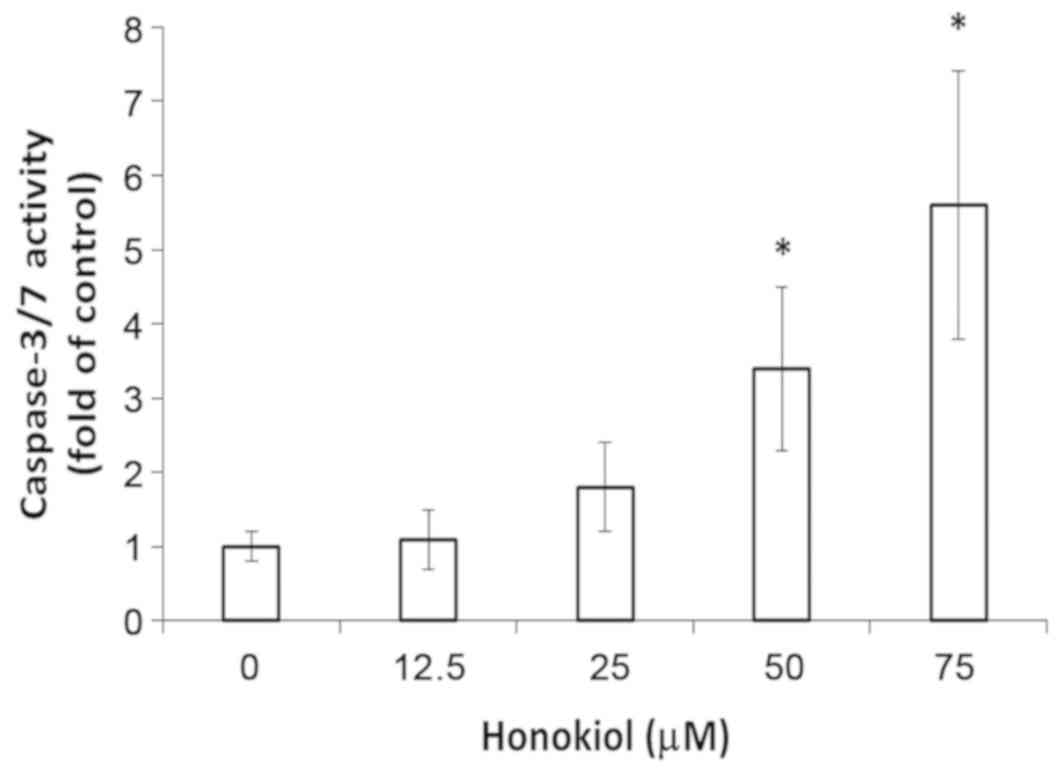 Finally, the caspase activities in honokiol-treated bladder cancer cells were investigated. As presented in Fig. 6, caspase-3/7 was significantly activated in high-dose honokiol-treated bladder cancer cells in comparison with untreated control cells after 36 h of incubation (P<0.05). These results indicated that the intrinsic apoptotic pathway may have a critical role in honokiol-triggered apoptosis in bladder cancer cells.