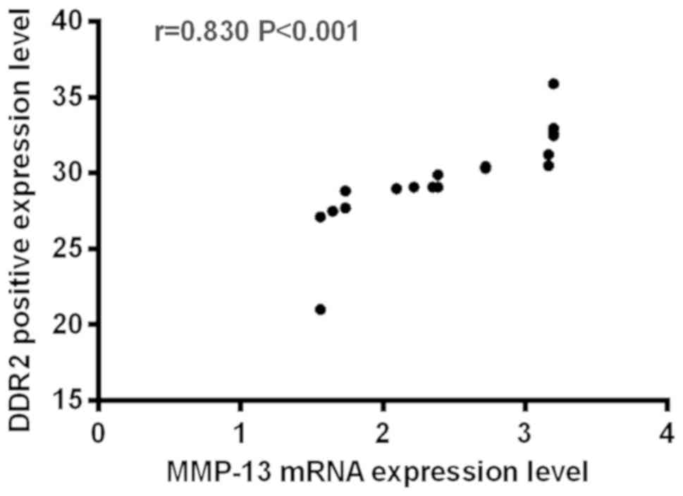 According to Pearson's correlation analysis, there was a positive correlation between MMP-13 mRNA and DDR2 in KOA rats (r=0.830, P<0.001), as shown in Fig. 1.