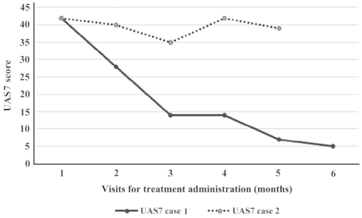 With the consent of the parents, we initiated the treatement with omalizumab 300 mg/month, starting from an urticaria activity score for the preceding 7 days (UAS7) of 42 (Table I). Upon a promising improvement after the first three doses, the activity score of urticaria worsened again, thus at the end of the 5 doses of treatment, the UAS7 score was insignificantly modified (Fig. 1) and the patient and his family refused at this point to do the sixth dose of omalizumab from the schedule. Like in the previous case, the administration of omalizumab was very well tolerated, without side effects but the desired improvement of urticaria was not obtained for this patient. The lack of answer to recombinant monoclonal antibodies, the fear of adverse effects of other drugs (cyclosporine), determined the parents of the adolescent to refuse another option as add-on therapy and they decided to return to previous treatment schedule (non-sedating antihistamines, montelukast, OCS at need).