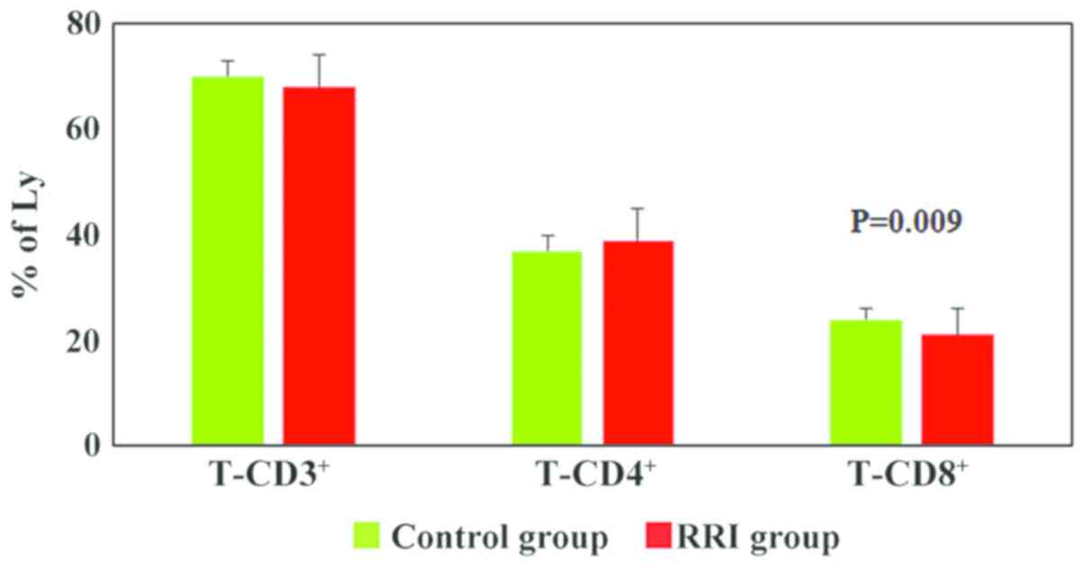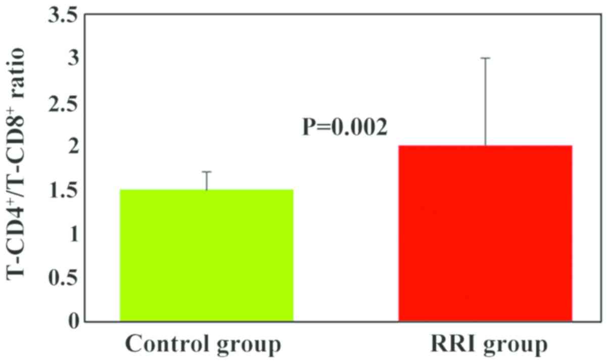 The T-CD4+/T-CD8+ ratio was higher in the RRI group (2±1) as compared to the control group (1.5±0.2), and the differences between the experimental groups were statistically significant (P=0.002; Fig. 2). A significant number of children with RRIs (63%) exhibited an increased value for the T-CD4+/T-CD8+ ratio (Table I).