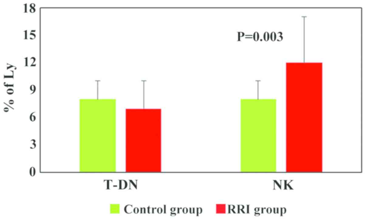 The percentages of PB T cell subsets and NK cells (T cells, T-CD4+ cells, T-CD8+ cells, T-DN cells, NK cells and NKT cells) for 30 children with RRIs were compared with the data obtained from 10 healthy children (control group). The analysis of T cell subpopulations revealed a significant decrease in the T-CD8+ lymphocytes percentages (P=0.009) in children with RRIs (21±5% cells as compared to 24±2% in the control group). The percentages of T-CD3+ and T-CD4+ lymphocytes were similar between the patients and the control group (Fig. 1).