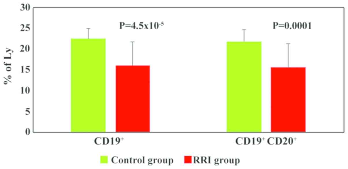 The main change observed in panel B analysis was the decrease in the total B cell population percentages in most of the children with RRIs (86%) (Table II). The mean values of total B cells were significantly lower in the children with RRIs (16.14±6, P=4.5×10−5) as compared to the control group (22.56±2) (Fig. 4).