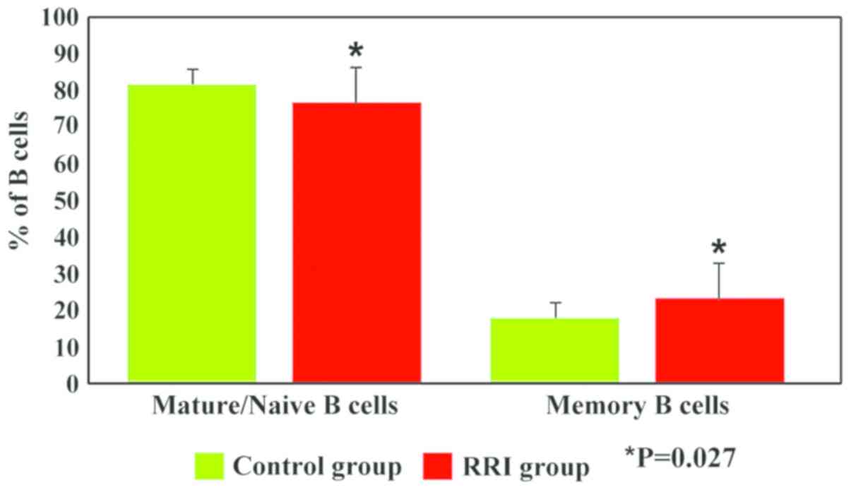 The PB total B lymphocytes were divided into 2 subsets based on CD27 expression: Mature/naive B cells (CD27−) and memory B cells (CD27+). Both subsets exhibited significant differences (P=0.027) between the children with RRIs and the controls. Thus, our data revealed a decrease in the percentage of mature/naive B cells (76.8±10 vs. 81.95±4, P=0.027) and an increase in the percentage of memory B cells (23.2±10 vs. 18.05±4, P=0.027) in children with RRIs as compared to the control group (Fig. 5).