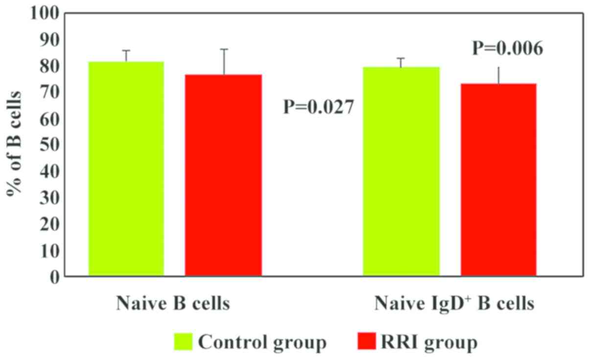 Mature/naive B cells were analysed based on the expression of IgD. In the children with RRIs, the numbers of naive IgD+ B cells were significantly lower (73.3±10, P=0.006) than those in the control group (79.59±4) (Fig. 6). In addition, 61% of the children with RRIs exhibited low values for naive IgD+ B cells (Table II). We hypothesised that the decrease in the numbers of total B lymphocytes was mainly due to the decrease in mature/naive IgD+ B lymphocytes.