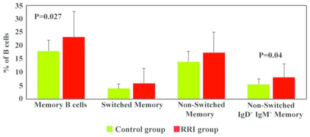 Memory B cells were analysed according to the expression of IgD and IgM and divided into switched memory B cells (IgD−IgM−), non-switched memory B cells (IgM/IgD+) and non-switched IgD+IgM+ memory B cells (Fig. 7). The numbers of memory B cells were significantly increased in the RRI group (23.2±10 vs. 18.05±4 in healthy children, P=0.027; Fig. 7). All memory B cell subsets were increased in the children with RRIs; however, statistically significant differences between the RRI group and the control group were only observed for non-switched IgD+IgM+ memory B cells (P=0.04).