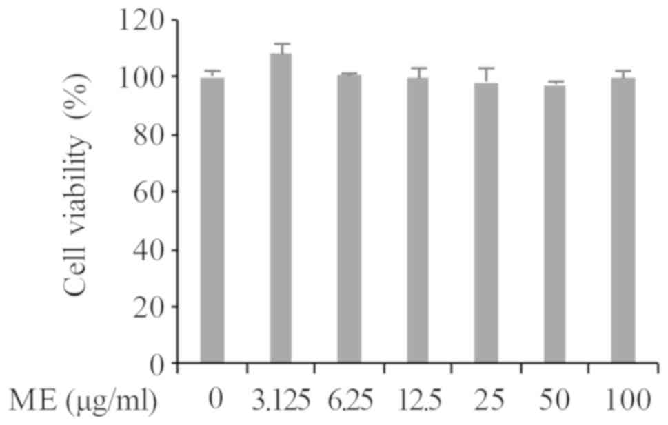A Water-soluble Tetrazolium salts (WST) assay was used to determine cell viability. Cells were pre-treated with various concentrations of myrrh (0, 3.125, 6.25, 12.5, 25, 50 and 100 µg/ml) for 24 h at 37°C. A total of 0.01 ml EZ-Cytox reagent (DoGenBio) was added and cells were subsequently incubated at 37°C for 4 h. Absorbance was measured at 540 nm using a microplate reader (Tecan Group, Ltd.).