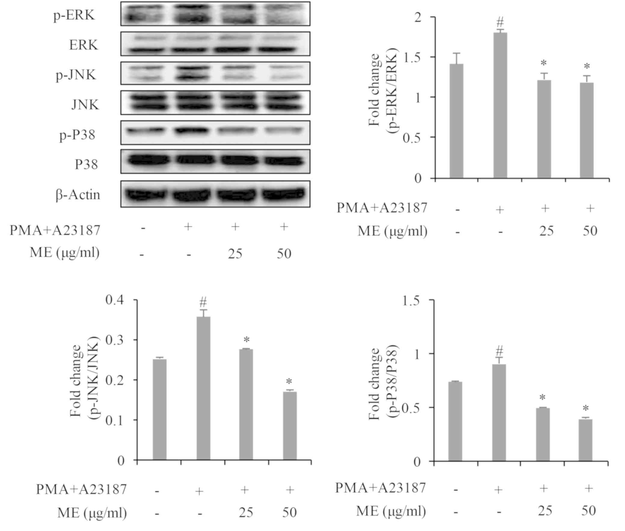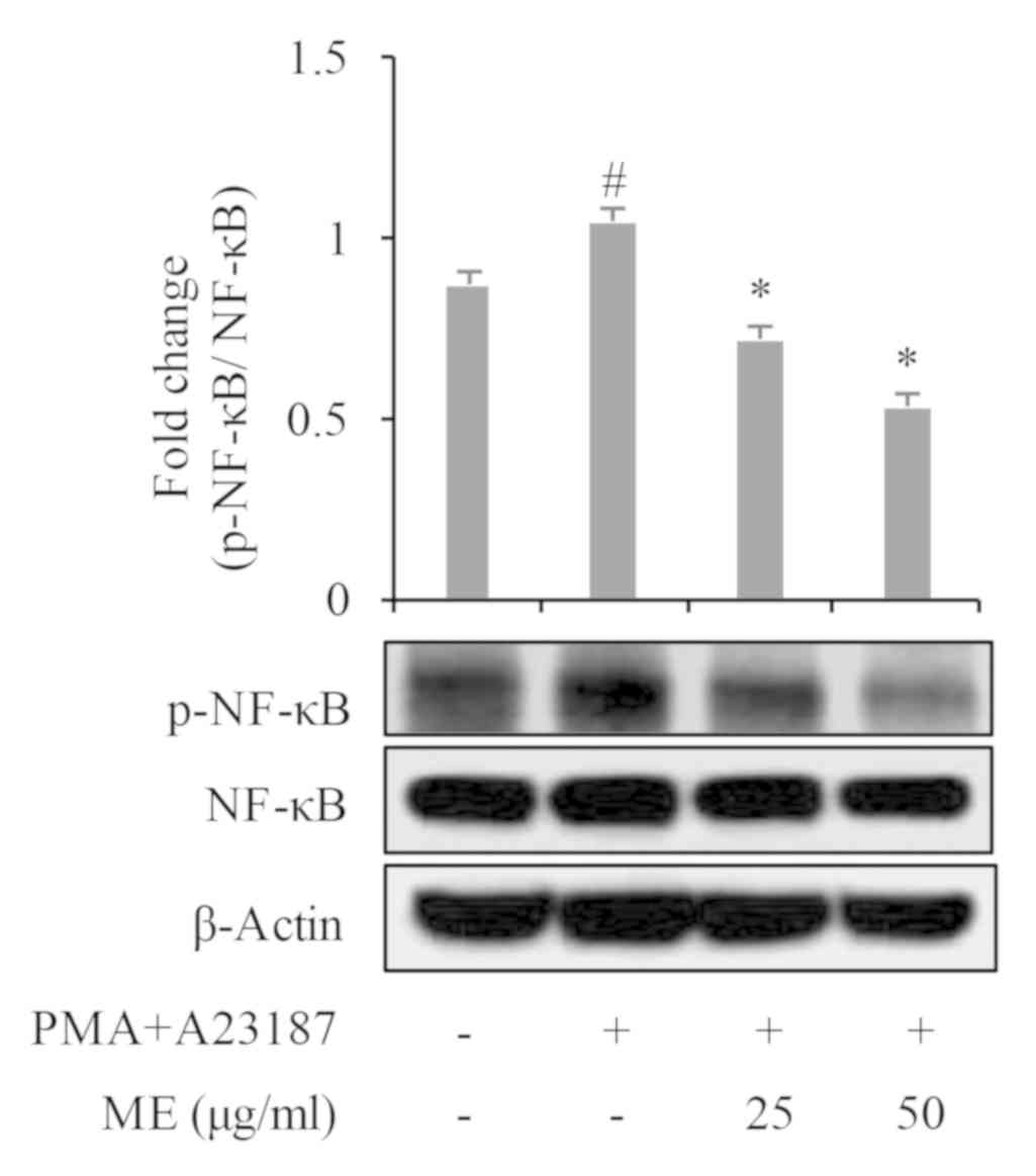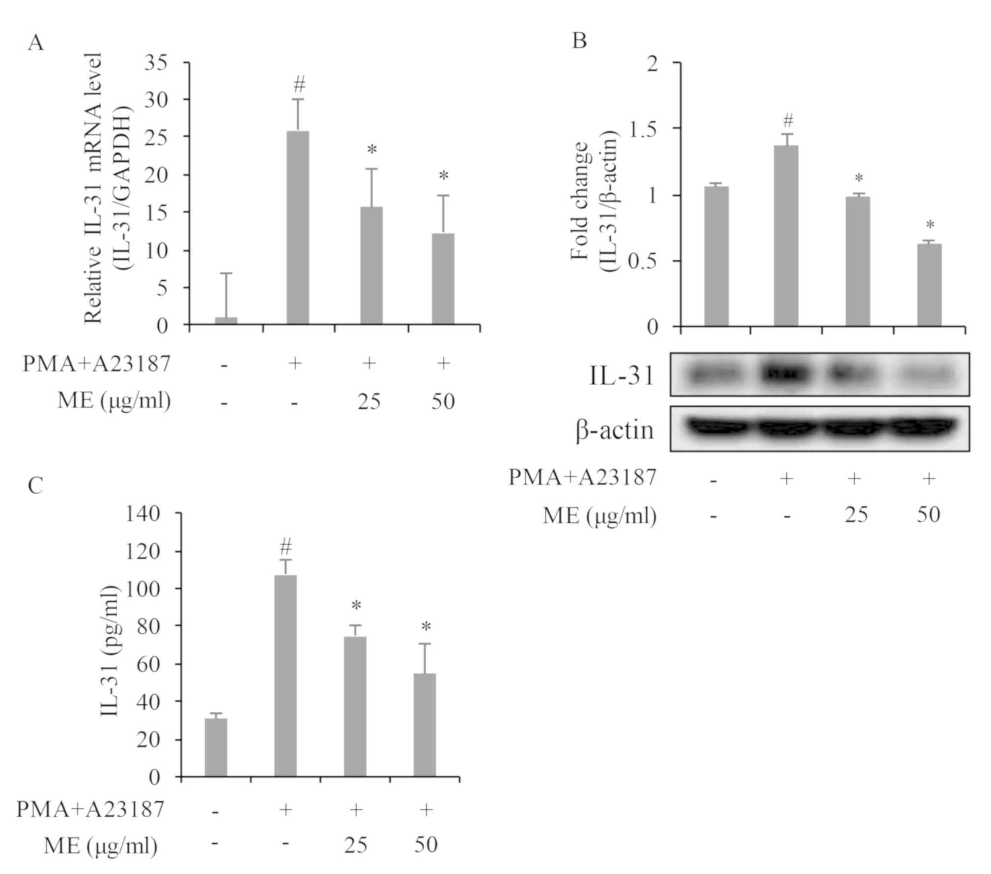 Antibodies against IL-31 (cat. no. sc-515415), ERK1/2 (cat. no. sc-135900), phospho-ERK1/2 (cat. no. sc-81492), p38 (cat. no. sc-81621), phospho-p38 (cat. no. sc-166182), JNK (cat. no. sc-7345), phospho-JNK (cat. no. sc-293136), NF-κB/p65 (cat. no. sc-8008) and phospho-NF-κB/p65 (cat. no. sc-136548) were purchased from Santa Cruz Biotechnology, Inc. Antibodies against β-actin (cat. no. 612657) were purchased from Bioscience. PMA and A23187 were purchased from Sigma-Aldrich (Merck KGaA). Western blotting reagent and western blotting buffer were purchased from Bio-Rad Laboratories, Inc. and Thermo Fisher Scientific, Inc., respectively. ELISA kits for IL-31 (cat. no. 445704) and histamine (cat. no. ENZKIT140-0001) were purchased from Biolegend, Inc. and Enzo Life Sciences, Inc., respectively. All subsequent chemicals used in the current study were reagent grade and have been listed within the text.