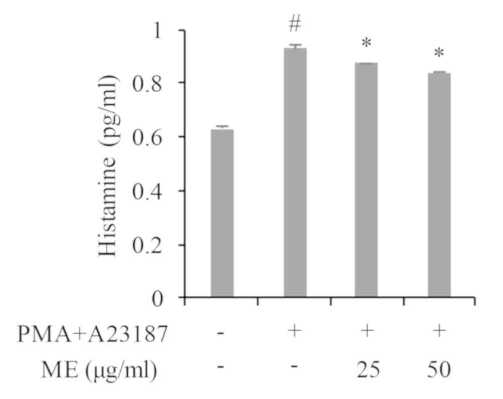 As histamine has been widely implicated in AD itch, the effect of myrrh extract on histamine release was also investigated in the current study. As presented in Fig. 3, treatment with PMA+A23187 significantly stimulated histamine release in HMC-1 cells. However, cells treated with myrrh extract (25 and 50 µg/ml) exhibited a dose-dependent and significant decrease in histamine release.