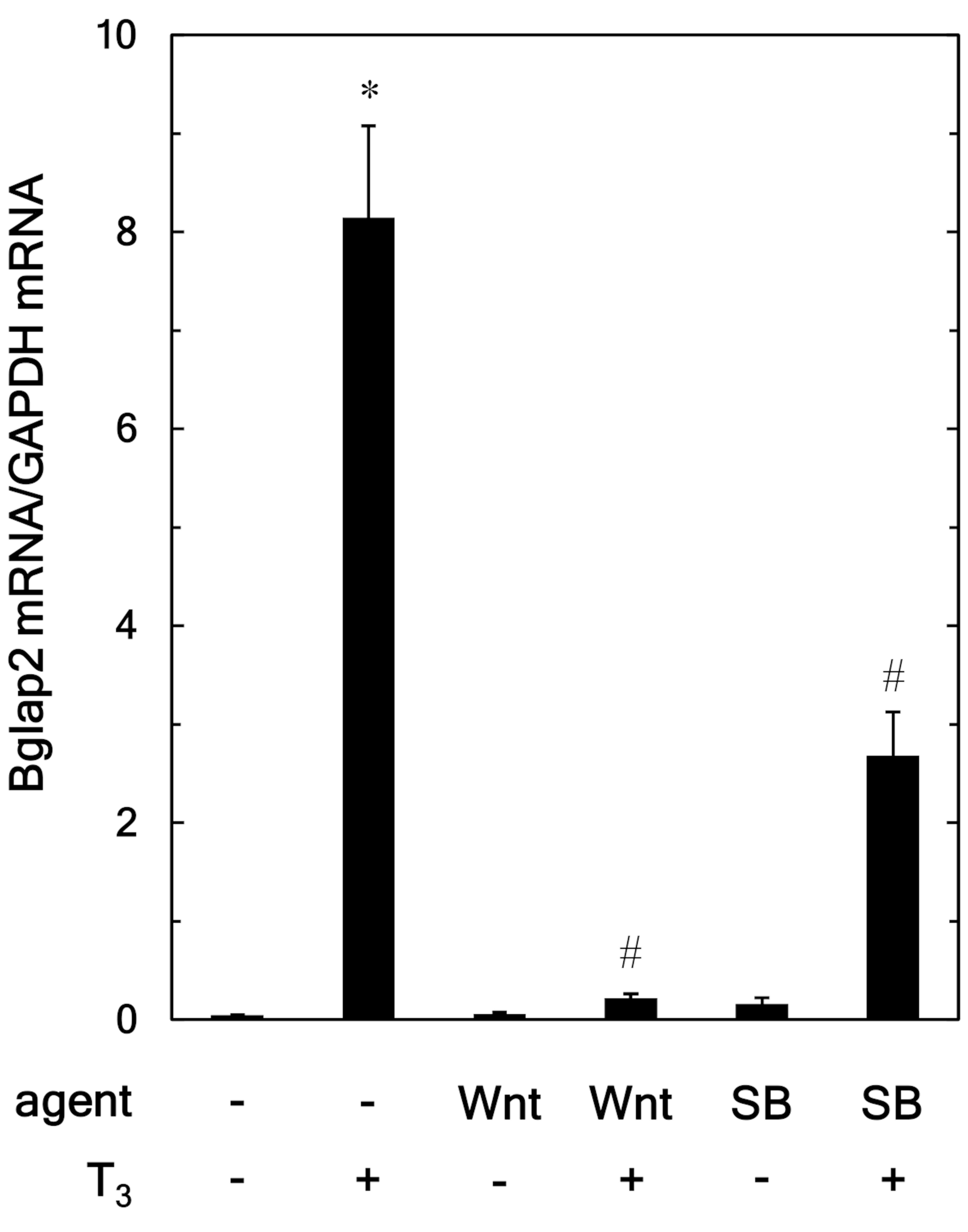 In the present study, we investigated the effect of Wnt3a on the T3-stimulated osteocalcin expression in osteoblast-like MC3T3-E1 cells.