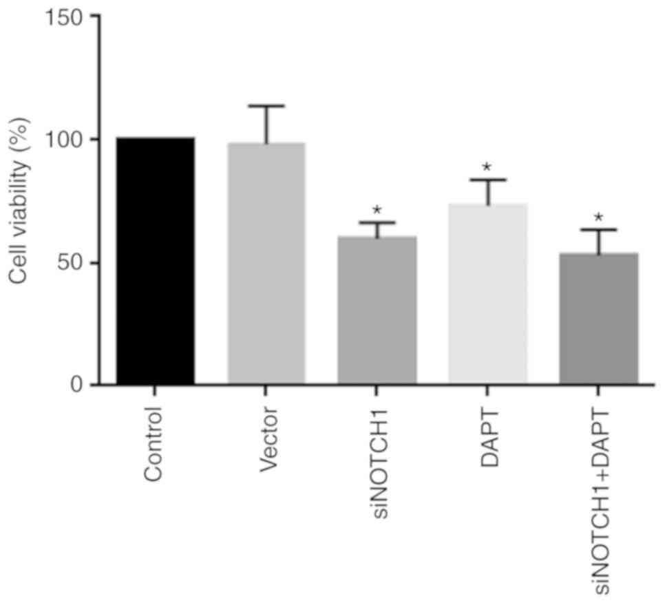 A BMSC cell line was gifted by Professor Yang Xiang (Human Aging Research Institute, Nanchang University, Nanchang, China) and cultured in GlutaMAXTM-1 Dulbecco's modified Eagle's medium (DMEM; cat. no. 1859228; Gibco; Thermo Fisher Scientific, Inc.) supplemented with 10% fetal bovine serum (FBS; Hyclone; GE Healthcare Life Sciences) in 5% CO2. at 37°C. The cells were divided into the following five groups: Control, vector, small interfering RNA (siRNA)-Notch1, γ-secretase inhibitor (DAPT; Selleck Chemicals), and siRNA Notch1 + γ-secretase inhibitor groups. Cells (5×103/well) at 80% confluence were transfected with 1 µg/ml empty vector (F: 5-CCUACGCCACCAAUUUCGU-3′, R:5-ACGAAAUUGGUGGCGUAGG-3) or Notch1-siRNA (F: 5-GCACGCGGAUUAAUUUGCA-3′, R: 5-UGCAAAUUAAUCCGCGUGC-3′; GenePharma Co. Ltd.) using Lipofectamine® 3000 (Invitrogen; Thermo Fisher Scientific, Inc.). After 6 h, the medium was replaced with fresh DMEM containing 10% FBS and cultured in a 5% CO2. incubator at 37°C for 48 h. The cells (5×103/well) were then cultured in normal medium and treated with 5 µM DAPT for an additional 24 h. Cell proliferation was confirmed and tumor-related proteins were detected.