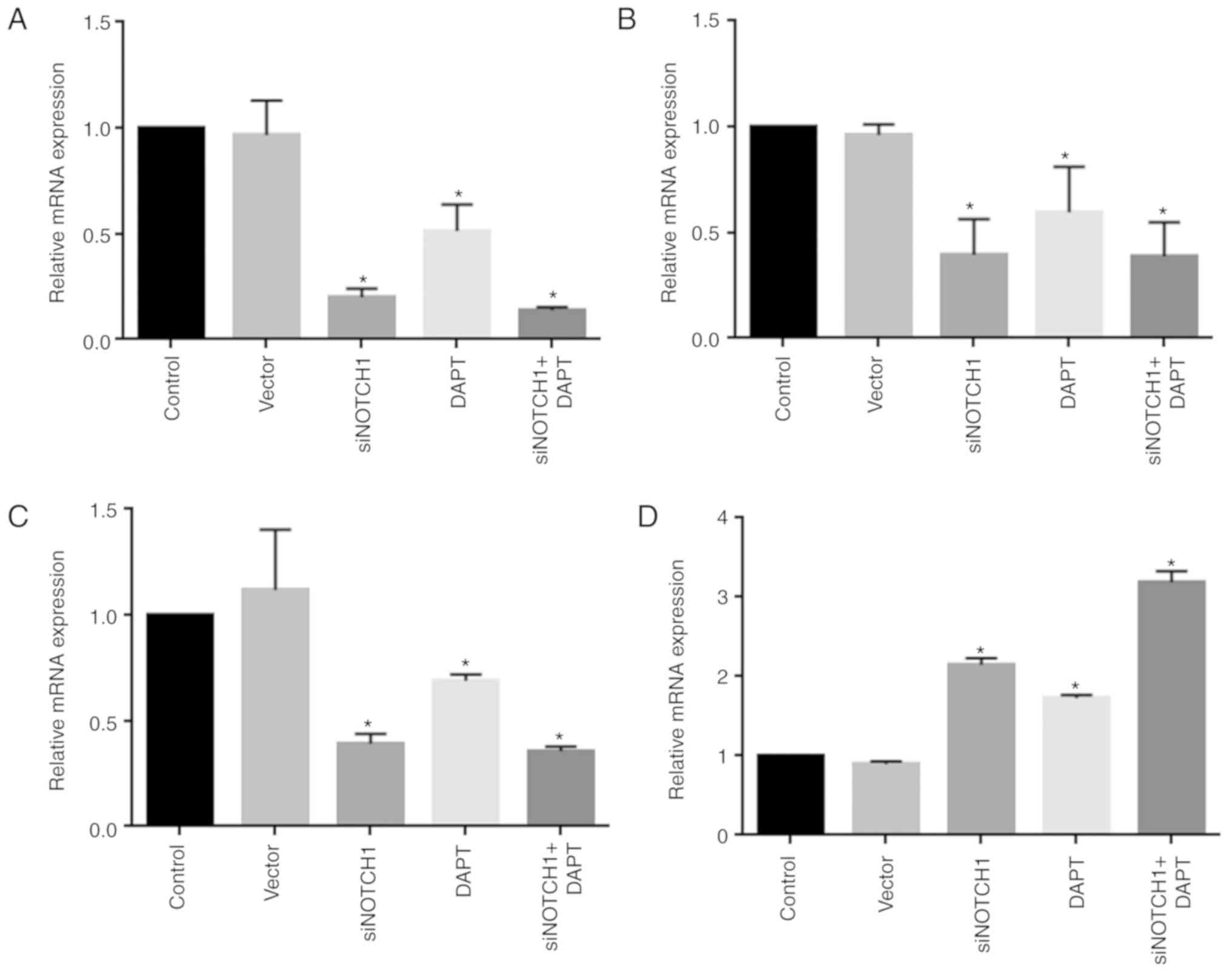 As shown in Fig. 2A-D, treatment with siRNA Notch1 and the γ-secretase inhibitor significantly reduced the expression of Notch1, TGF-β1 and c-Myc, and promoted the expression of p53 at the mRNA level, respectively, compared with levels in the control (P<0.05). Combined treatment with siRNA-Notch1 and the γ-secretase inhibitor did not alter gene expression to a greater extent than single siRNA Notch1 or γ-secretase inhibitor treatment.