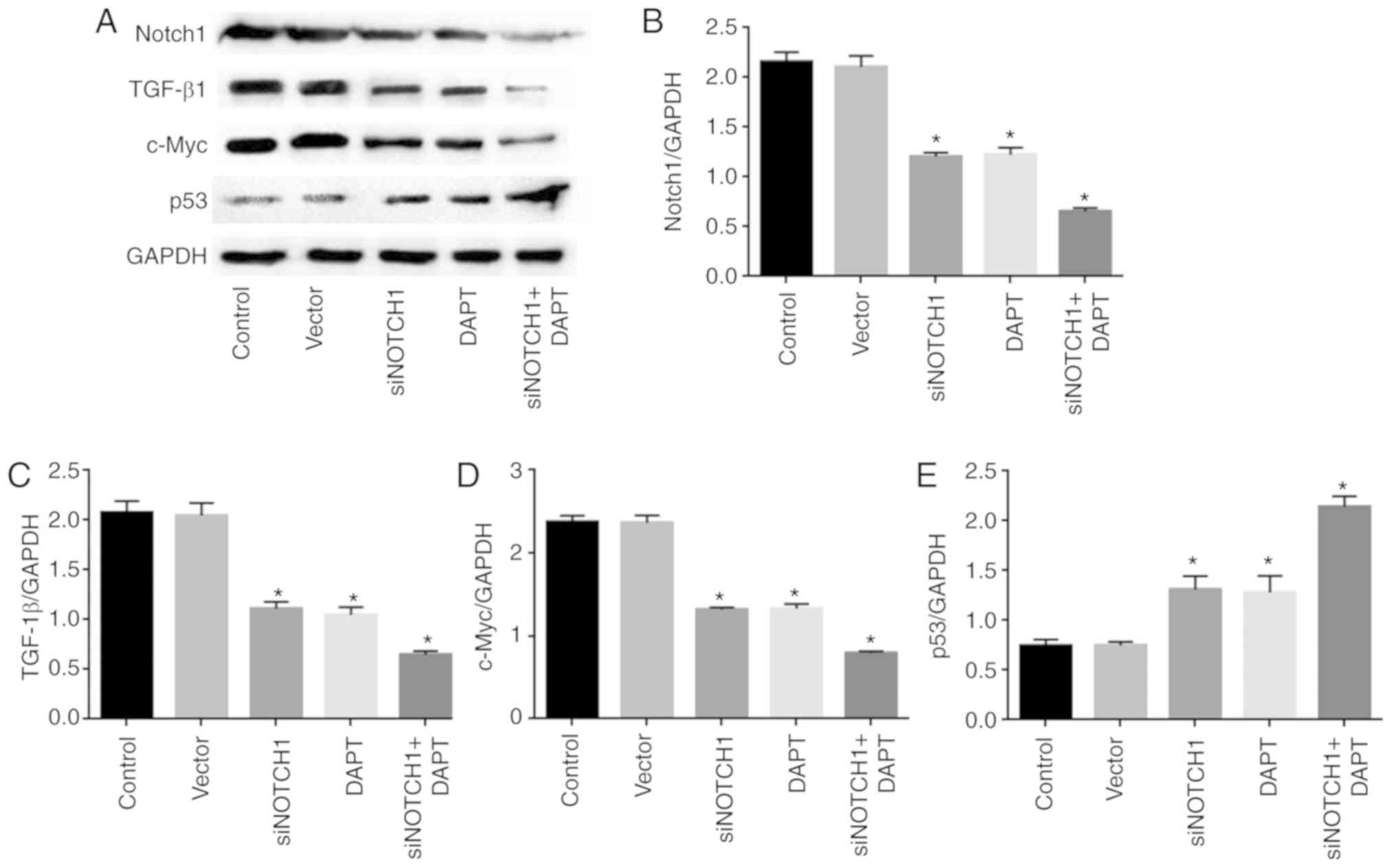c-Myc is one of the three closely related transcription factor family genes, and Myc genes are upregulated in various types of human cancer. The upregulated expression of c-Myc promotes cell proliferation and cell growth, the synthesis of ribosomes and proteins, energy production (i.e. glycolysis) and anabolism (32,33). The present study found that siRNA-Notch1 and γ-secretase inhibitor treatment reduced the expression of TGF-β1 and c-Myc and increased the expression of p53. Excessive expression of c-Myc reduces the effect of growth factors and promotes cell proliferation. It also downregulates c-Myc and may arrest cells at the G1 phase, thus slowing the rate of cell growth (34).