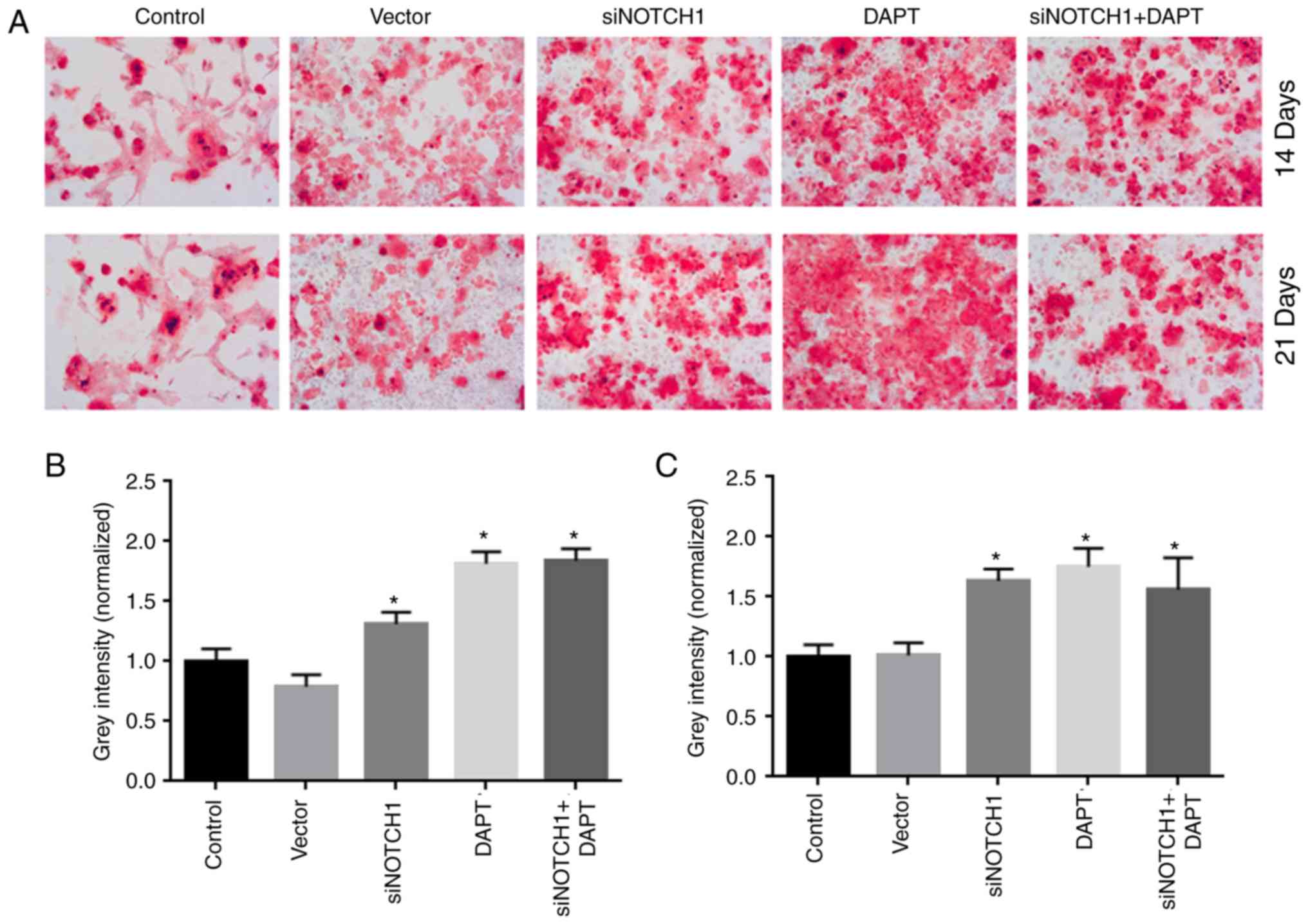 As shown in Fig. 4A, siRNA Notch1 and γ-secretase inhibitor treatment significantly accelerated osteogenic differentiation at days 14 and 21, respectively, compared with that in the control group (P<0.05). Combined siRNA-Notch1 and γ-secretase inhibitor treatment did not promote osteogenic differentiation to a greater extent than single siRNA-Notch1 or γ-secretase inhibitor treatment.