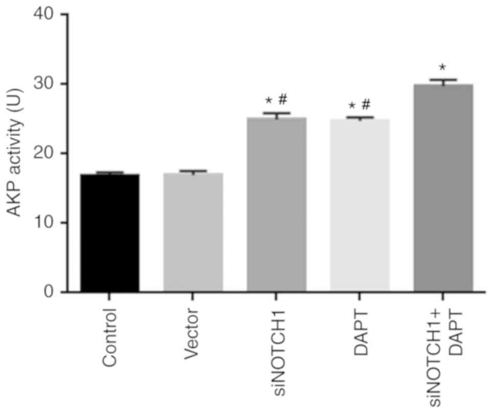 As shown in Fig. 5, siRNA-Notch1 and γ-secretase inhibitor treatment significantly promoted AKP activity, respectively, compared with that in the control (P<0.05). Combined siRNA-Notch1 and γ-secretase inhibitor treatment further promoted osteogenic differentiation compared with that following treatment with either siRNA-Notch1 or γ-secretase inhibitor treatment alone.