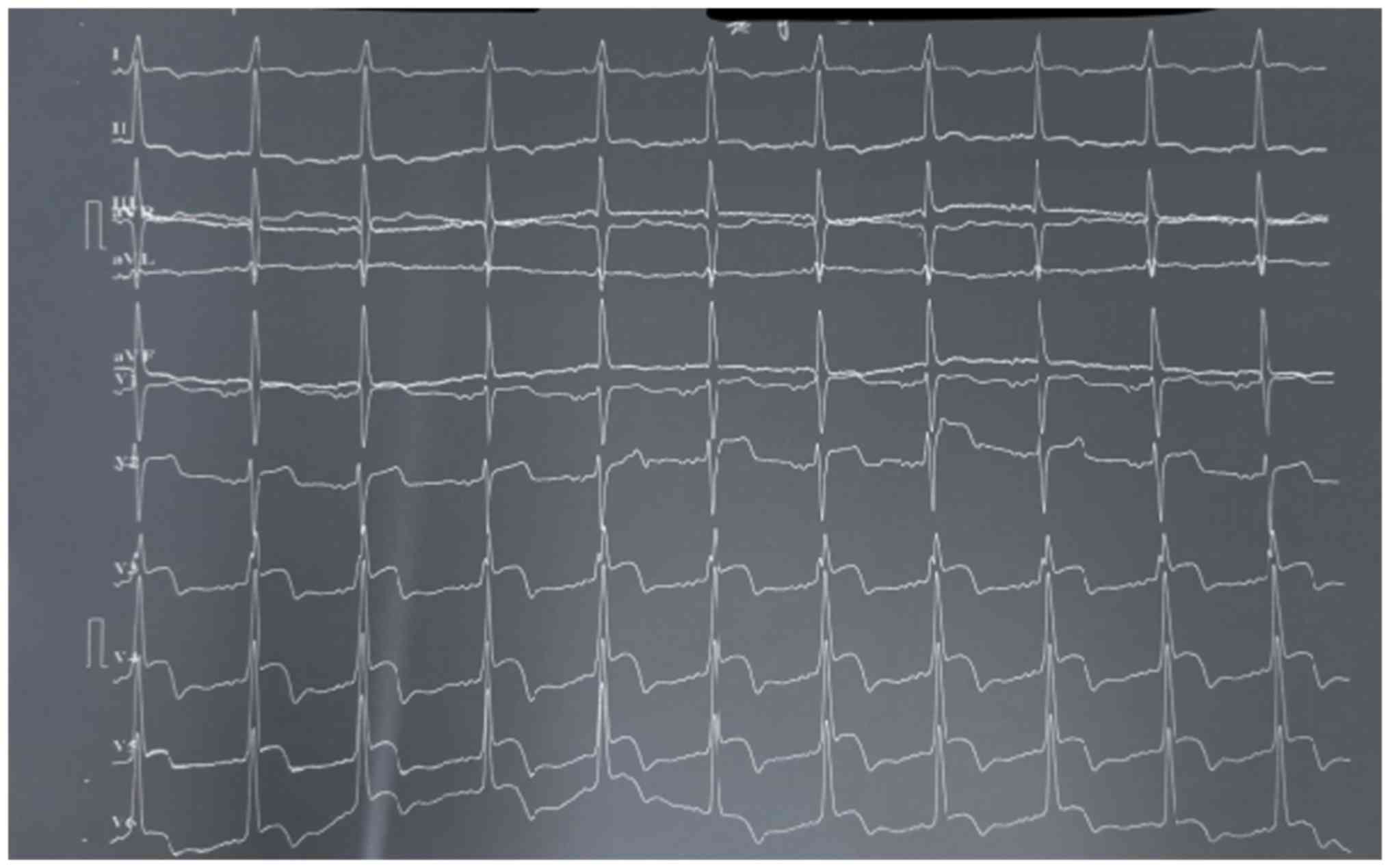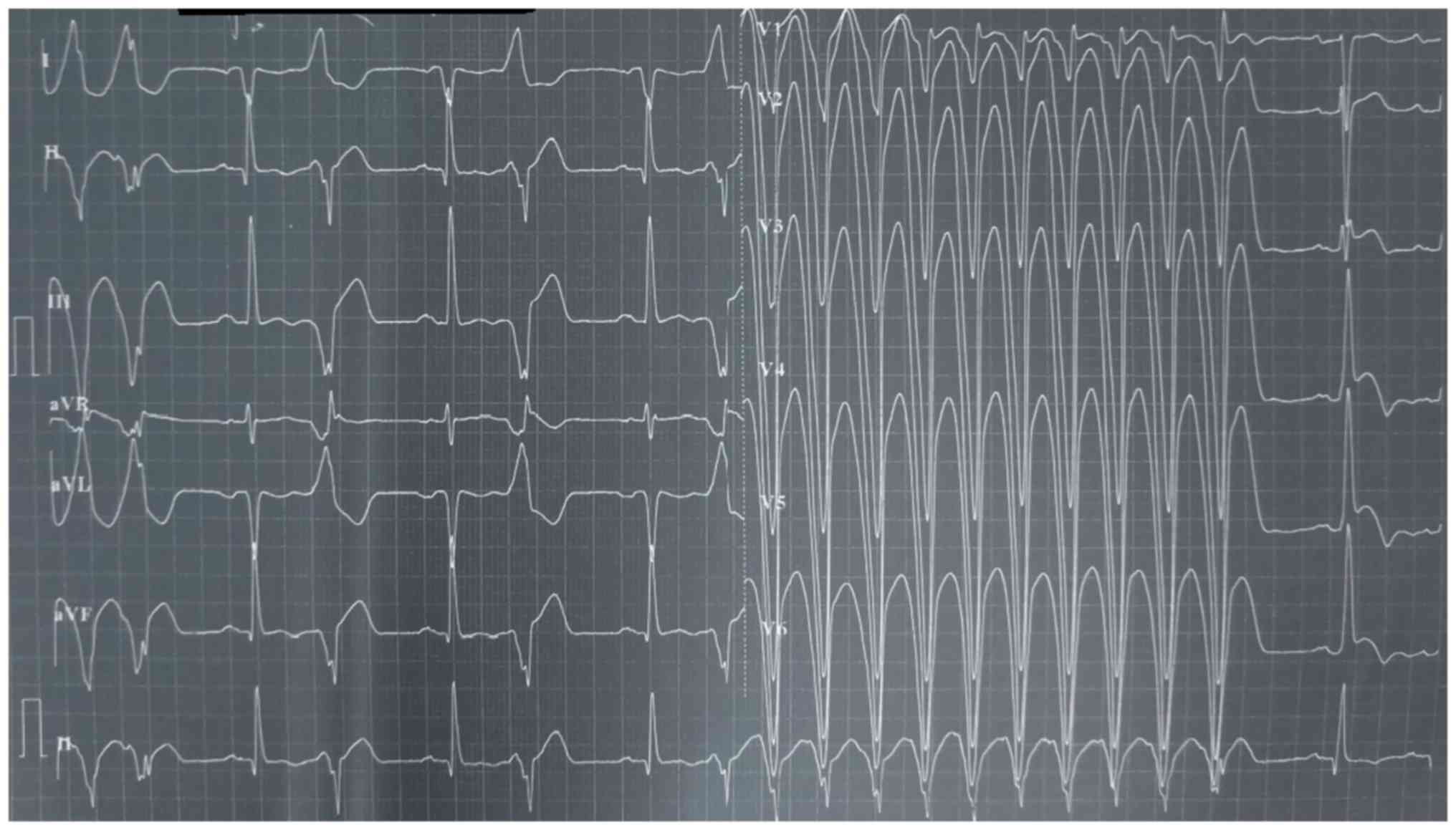 A 61-year-old Chinese male was admitted to his local cardiology department in June 2016 due to episodes of syncope after palpitation at rest. The patient had no family history of heart disease and his electrocardiogram indicated monomorphic ventricular tachycardia (Fig. 1). The initial troponin I level was 42.96 ng/ml and the patient was diagnosed with ST-segment elevation myocardial infarction. The abnormal electrocardiogram prompted invasive coronary angiography, which provided no evidence of obstructive coronary artery disease. The electrocardiogram that was then performed exhibited sinus rhythm, ST elevation and T wave abnormality (Fig. 2). The sinus rhythm was quickly restored but could not be maintained.